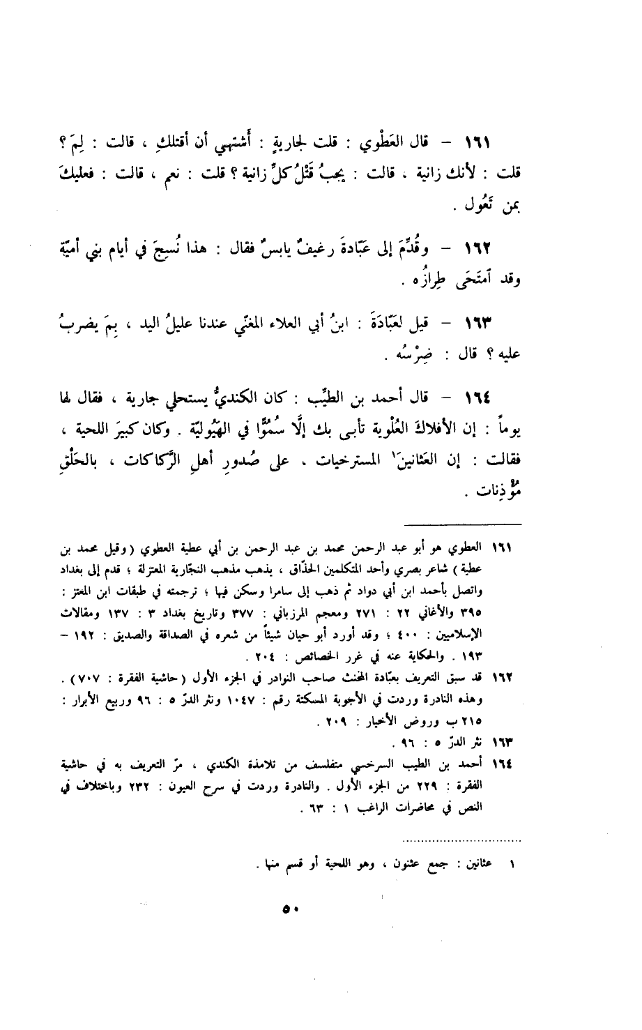 قال العطوي: قلت لجاريةٍ: أشتهي أن أقتلك، قالت: لم؟ قلت: لأنك زانية. قالت: يجب قتل كلّ زانية؟ قلت: نعم، قالت: فعليك بمن تعول.