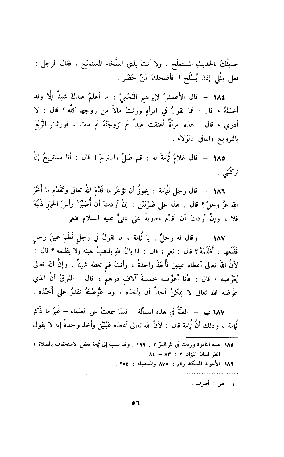 187ب - العلّة في هذه المسألة - فيما سمعت عن العلماء - غير ما ذكر ثمامة، وذلك أنّ ثمامة قال: لأنّ الله تعالى أعطاه عينين وأخذ واحدةٍ إنه لا يقول