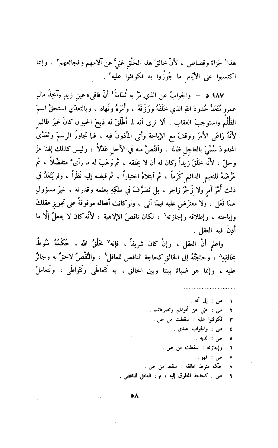 187د - والجواب عن الذي مرّ به ثمامة أنّ فاقئ عين زيدٍ وآخذ مال عمروٍ متعدٍّ حدود الله الذي خلقه ورزقه، وأمره ونهاه، وبالتعدّي استحقّ اسم الظّلم واستوجب العقاب. ألا ترى أنه لما أطلق له ذبح الحيوان كان غير ظالمٍ لأنّه راعى الأمر ووقف مع الإباحة وأتى المأذون فيه، فلما تجاوز الرسم وتعدّى المحدود سمّي بالعاجل ظالماً، واقتصّ منه في الآجل عدلاً؛ وليس كذلك إلهنا عزّ وجلّ، لأنّه خلق زيداً وكان له أن لا يخلقه، ثم وهب له ما رأى متفضّلاً، ثم عرّضه للنعيم الدائم كرماً، ثم ابتلاه اختياراً، ثم قبضه إليه نظراً، ولم يتعدّ في ذلك أمر آمر ولا زجر زاجر، بل تصرّف في ملكه بعلمه وقدرته، غير مسؤولٍ عمّا فعل، ولا معترضٍ عليه فيما أتى، ولو كانت أفعاله موقوفةً على تجويز عقلك وإباحته، وإطلاقه وإجازته، لكان ناقص الإلاهية، لأنّه كان لا يفعل إّلا ما أذن فيه العقل.