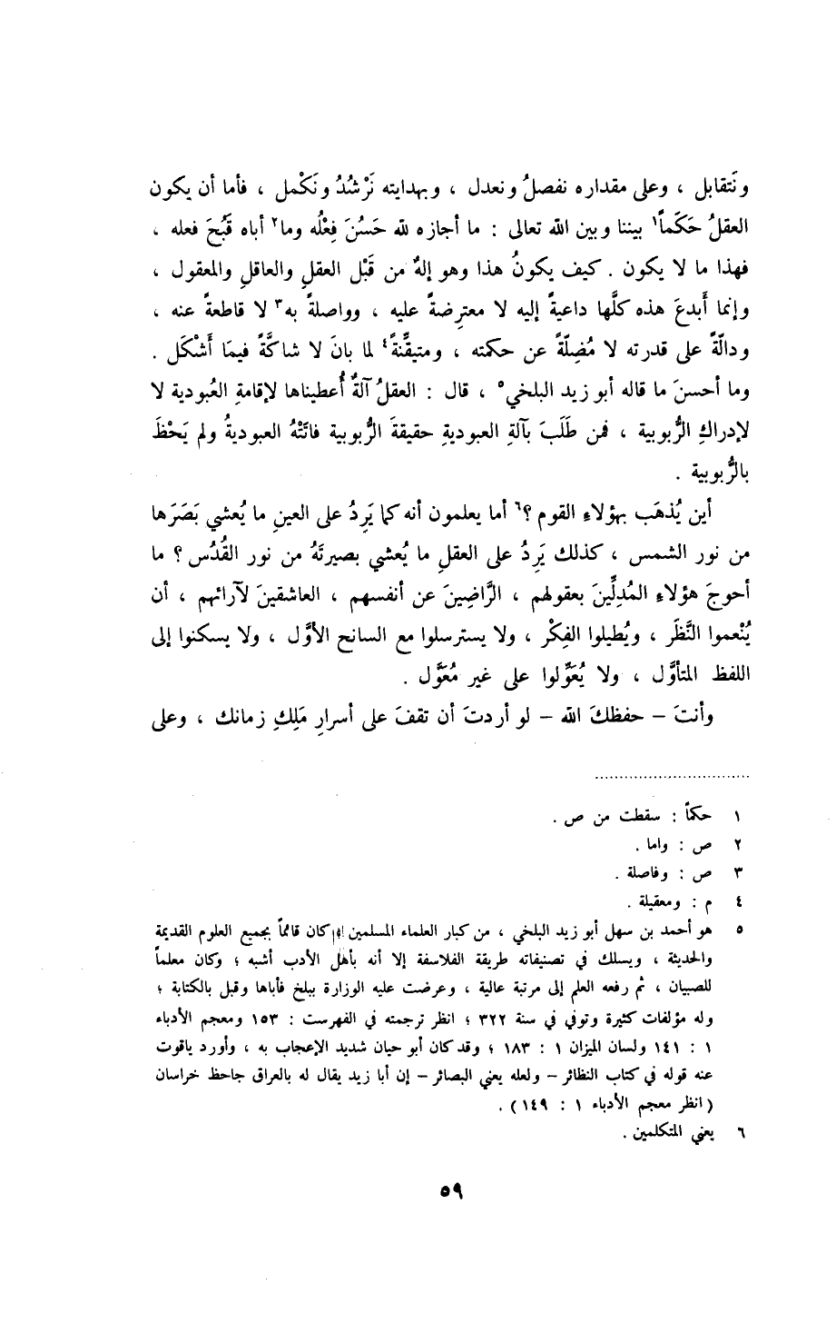 ونتقابل، وعلى مقداره نفصل ونعدل، وبهدايته نرشد ونكمل، فأما أن يكون العقل حكماً بيننا وبين الله تعالى: ما أجازه الله حسن فعله وما أباه قبح فعله، فهذا ما لا يكون. كيف يكون هذا وهو إلهٌ من قبل العقل والعاقل والمعقول، وإنما أبدع هذه كلّها داعيةً إليه لا معترضةً عليه، وواصلةً به لا قاطعةً عنه، ودالةً على قدرته لا مضلّةً عن حكمته، ومتيقّنةً لما بان لا شاكّةً فيما أشكل. وما أحسن ما قاله أبو زيد البلخي، قال: العقل آلةٌ أعطيناها لإقامة العبودية لا لإدراك الرّبوبية، فمن طلب بآلة العبودية حقيقة الرّبوبية فاتته العبودية ولم يحظ بالرّبوبية.