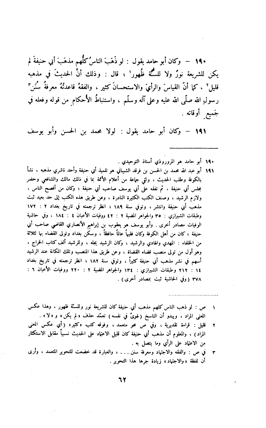 وكان أبو حامد يقول: لو ذهب الناس كلّهم مذهب أبي حنيفة لم يكن للشريعة نورٌ ولا للسّنة ظهور؛ قال: وذلك أنّ الحديث في مذهبه قليل، كما أنّ القياس والرأي والاستحسان كثير، والفقه قاعدته معرفة سنن رسول الله صلّى الله عليه وسلّم، واستنباط الأحكام من قوله وفعله في جميع أوقاته.
