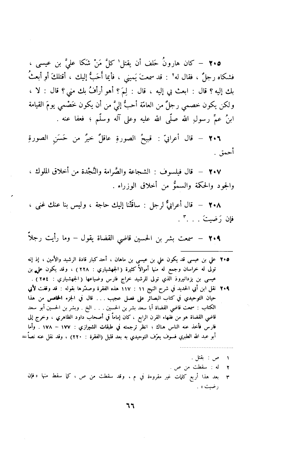كان هارون حلف أن يقتل كلّ من شكا عليّ بن عيسى، فشكاه رجلٌ، فقال له: قد سمعت يميني، فأيما أحبّ إليك، أقتلك أو أبعث بك إليه؟ قال: ابعث بي إليه، قال: لم؟ أهو أرأف بك مني؟ قال: لا، ولكن يكون خصمي رجلٌ من العامّة أحبّ إليّ من أن يكون خصمي يوم القيامة ابن عمّ رسول الله صلّى الله عليه وعلى آله وسلّم؛ فعفا عنه قال أعرابيّ: قبيح الصورة عاقلٌ خيرٌ من حسن الصورة أحمق.