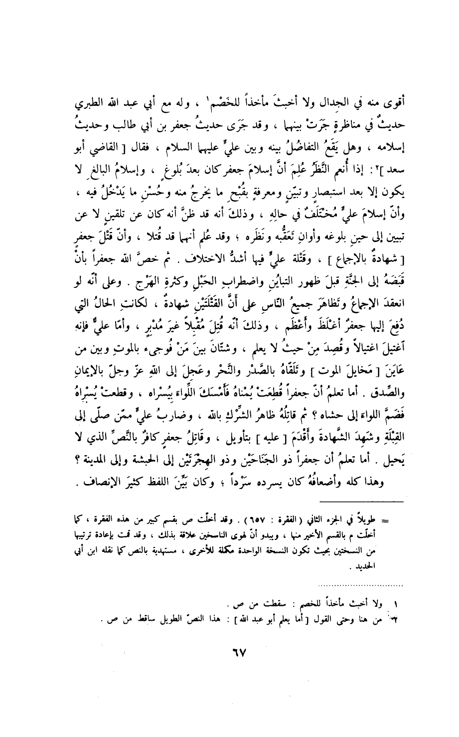 أقوى منه في الجدال ولا أخبث مأخذاً للخصم، وله مع أبي عبد الله الطبري حديثٌ في مناظرةٍ جرت بينهما، وقد جرى حديث جعفر بن أبي طالب وحديث إسلامه، وهل يقع التفاضل بينه وبين عليّ عليهما السلام، فقال القاضي أبو سعد: إذا أنعم النّظر علم أنّ إسلام جعفر كان بعد بلوغٍ، وإسلام البالغ لا يكون إلا بعد استبصار وتبيّن ومعرفةٍ بقبح ما يخرج منه وحسن ما يدخل فيه، وإنّ إسلام عليٍّ مختلفٌ في حاله، وذلك أنه قد ظنّ أنه كان عن تلقين لا عن تبيين إلى حين بلوغه وأوان تعقّبه ونظره؛ وقد علم أنهما قد قتلا، وأنّ قتل جعفر شهادةٌ بالإجماع، وقتلة عليّ فيها أشدّ الاختلاف. ثم خصّ الله جعفراً بأن قبضه إلى الجنّة قبل ظهور التباين واضطراب الحبل وكثرة الهرج. وعلى أنّه لو انعقد الإجماع وتظاهر جميع النّاس على أنّ القتلتين شهادةٌ، لكانت الحال التي دفع إليها جعفرٌ أغلظ وأعظم، وذلك أنّه قتل مقبلاً غير مدبرٍ، وأمّا عليٌّ فإنه اغتيل اغتيالاً وقصد من حيث لا يعلم، وشتّان بين من فوجئ بالموت وبين من عاين مخايل الموت وتلقّاه بالصّدر والنّحر وعجل إلى الله عزّ وجلّ بالإيمان فضمّ اللواء إلى حشاه؟ ثم قاتله ظاهر الشّرك بالله، وضارب عليٍّ ممّن صلّى إلى القبلة وشهد الشّهادة وأقدم عليه بتأويل، وقاتل جعفر كافرٌ بالنّصّ الذي لا يحيل. أما تعلم أن جعفراً ذو الجناحين وذو الهجرتين إلى الحبشة وإلى المدينة؟ وهذا كله وأضعافه كان يسرده سرداً؛ وكان بيّن اللفظ كثير الإنصاف.