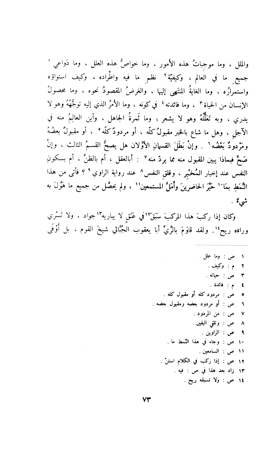 والملل، وما موجبات هذه الأمور، وما خواصّ هذه العلل، وما دواعي جميع ما في العالم، وكيفية نظم ما فيه واطّراده، وكيف استواؤه واستمراره، وما الغاية المنتهى إليها، والغرض المقصود نحوه، وما محصول الإنسان من الحياة، وما فائدته في كونه، وما الأمر الذي إليه توجهه وهو لا يدري، وبه تعلّله وهو لا يشعر، وما ثمرة الجاهل، وأين العالم منه في الآجل، وهل ما شاع بالخبر مقبولٌ كلّه، أو مردودٌ كلّه، أو مقبولٌ بعضه ومردودٌ بعضه. وإن بطل القسمان الأوّلان هل يصحّ القسم الثالث، وإن صحّ فبماذا يبين المقبول منه مما يردّ منه: أبالعقل، أم بالظنّ، أم بسكون النفس عند إخبار المخبر، وقلق النفس عند رواية الراوي؟ فأتى من هذا النّمط بما حيّر الحاضرين وأملّ المستمعين، ولم يحصّل من جميع ما هوّل به شيءٌ.