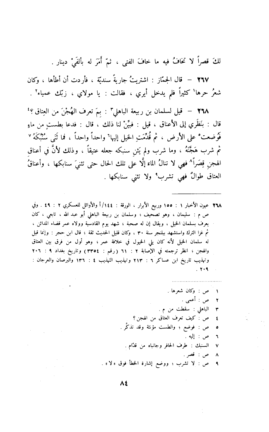 قيل لسلمان بن ربيعة الباهلي: بم تعرف الهجن من العتاق؟ قال: بنظري إلى الأعناق، قيل: فبيّن لنا ذلك، قال: فدعا بطستٍ من ماءٍ فوضعت على الأرض، ثم قدّمت الخيل إليها واحداً واحداً، فما ثنى سنبكه ثم شرب هجّنه، وما شرب ولم يثن سنبكه جعله عتيقاً، وذلك لأنّ في أعناق الهجن قصراً فهي لا تنال الماء إّلا على تلك الحال حتى تثني سنابكها، وأعناق العتاق طوالٌ فهي تشرب ولا تثني سنابكها.