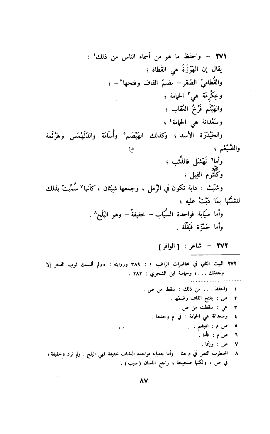 واحفظ ما هو من أسماء الناس من ذلك: يقال إن الهوزة قي القطاة؛ والقطاميّ الصّقر - بضمّ القاف وفتحها -؛ وعكرمة هي الحمامة؛ والهيثم فرخ العقاب؛ وسعدانة هي الحمامة؛ والحيدرة الأسد؛ وكذلك الهيصم وأسامة والدّلهمس وهرثمة والضّيغم؛ وأما نهشل فالذئب؛ وكلثوم الفيل؛ وشبث: دابة تكون في الرّمل، وجمعها شبثان، كأنها سمّيت بذلك لتشبّثها بما دبّت عليه؛ وأما سيابة فواحدة السّياب - خفيفةً - وهو البلح.