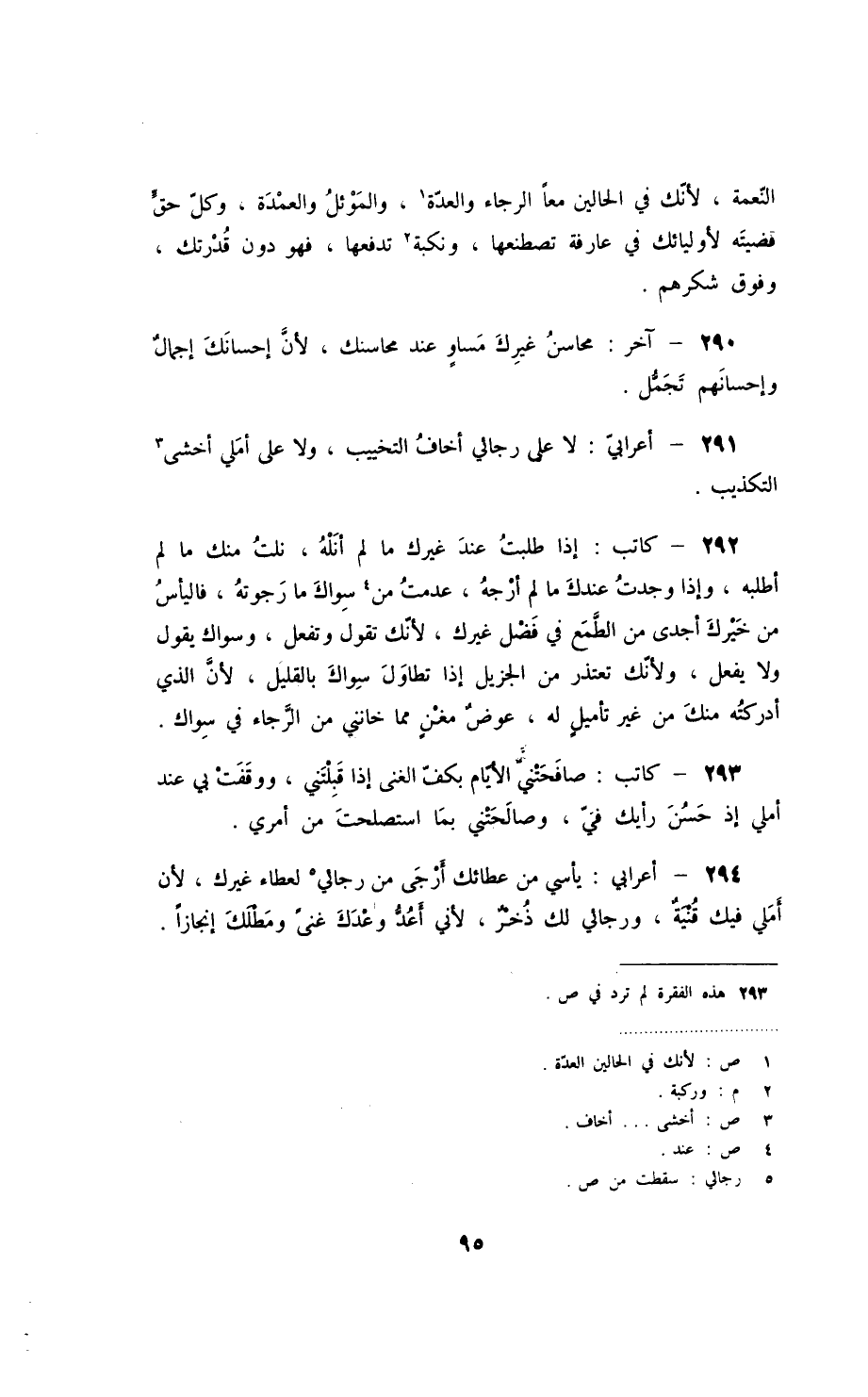 كاتب: إذا طلبت عند غيرك ما لم أنله، نلت منك ما لم أطلبه، وإذا وجدت عندك ما لم أرجه، عدمت من سواك ما رجوته، فاليأس من خيرك أجدى من الطّمع في فضل غيرك، لأنّك تقول وتفعل، وسواك يقول ولا يفعل، ولأنّك تعتذر من الجزيل إذا تطاول سواك بالقليل، لأنّ الذي أدركته منك من غير تأميلٍ له، عوضٌ مغنٍ مما خانني من الرّجاء في سواك.