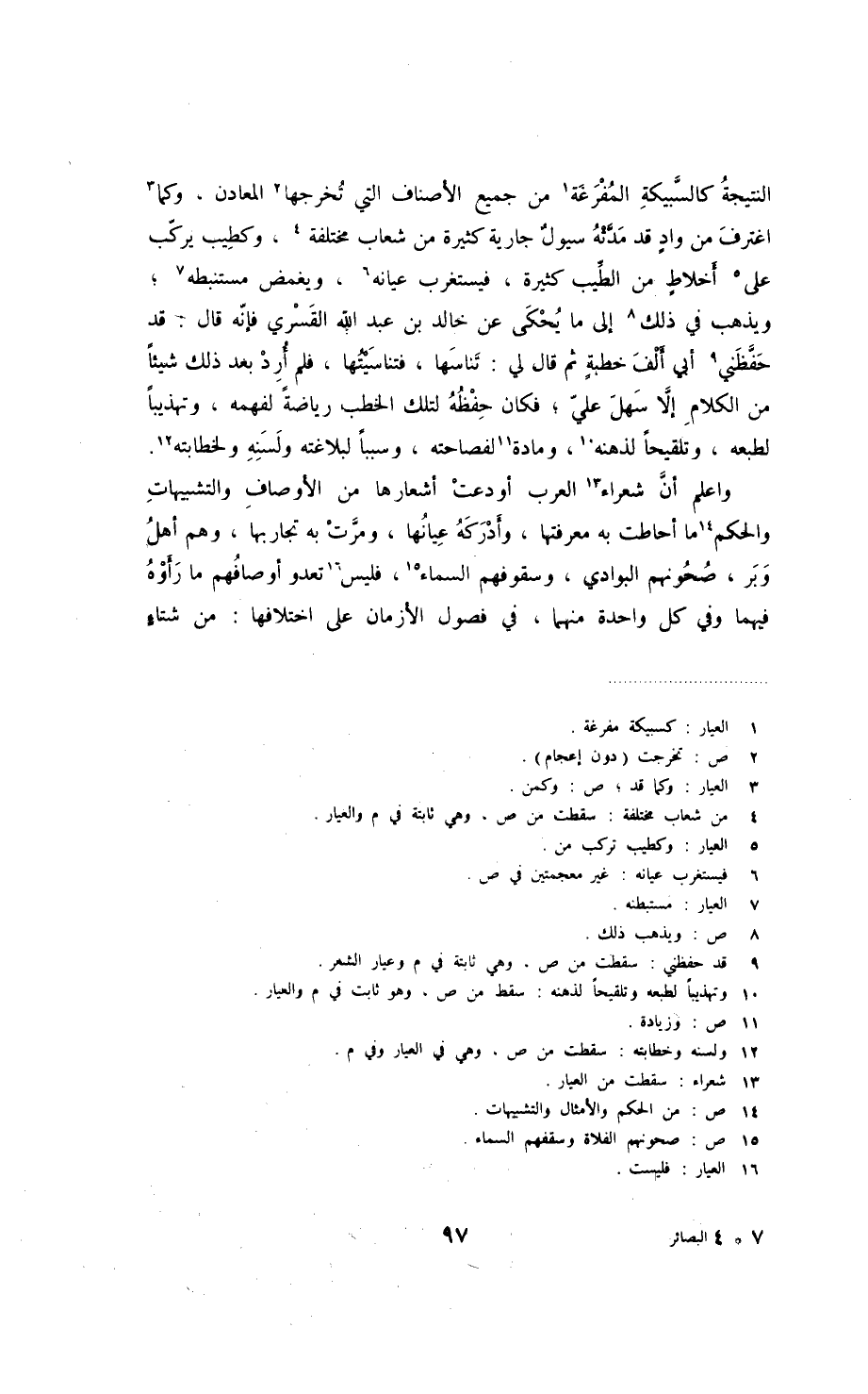واعلم أنّ شعراء العرب أودعت أشعارها من الأصناف والتشبيهات والحكم ما أحاطت به معرفتها، وأدركه عيانها، ومرّت به تجاربها، وهم أهل وبر، صحونهم البوادي، وسقوفهم السماء، فليس تعدو أوصافهم ما رأوه فيهما وفي كل واحدة منهما، في فصول الأزمان على اختلافها: من شتاءٍ