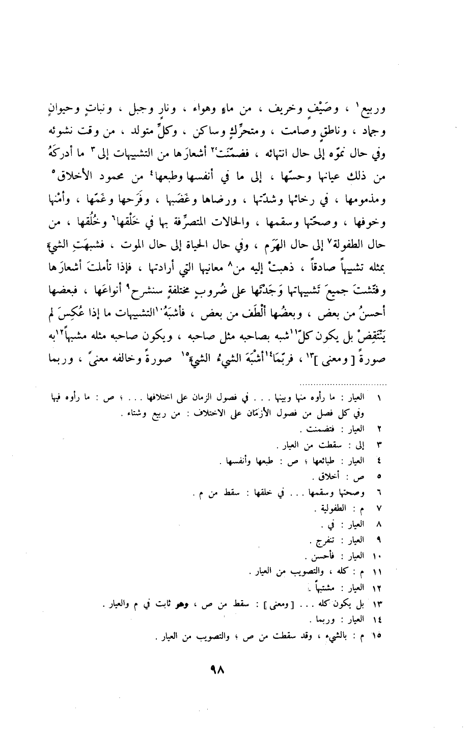 وربيع، وصيفٍ وخريف، من ماءٍ وهواء، ونار وجبل، ونباتٍ وحيوانٍ وجماد، وناطقٍ وصامت، ومتحرّك وساكن، وكلّ متولد، من وقت نشوته وفي حال نموّه إلى حال انتهائه، فضمّنت أشعارها من التشبيهات إلى ما أدركه من ذلك عيانها وحسّها، إلى ما في أنفسها وطبعها من محمود الأخلاق ومذمومها، في رخائها وشدّتها، ورضاها وغضبها، وفرحها وغمها، وأمنها وخوفها، وصحّتها وسقمها، والحالات المتصرّفة بها في خلقها وخلقها، من حال الطفولة إلى حال الهرم، وفي حال الحياة إلى حال الموت، فشبهت الشيء بمثله تشبيهاً صادقاً، ذهبت إليه من معانيها التي أرادتها، فإذا تأملت أشعارها وفتشت جميع تشبيهاتها وجدتها على ضروبٍ مختلفةٍ سنشرح أنواعها، فبعضها أحسن من بعض، وبعضها ألطف من بعض، فأشبه التشبيهات ما إذا عكس لن ينتقض بل يكون كلّ شبه بصاحبه مثل صاحبه، ويكون صاحبه مثله مشبهاً به صورةً ومعنى، فربّما أشبه الشيء الشيء صورةً وخالفه معنىً، وربما