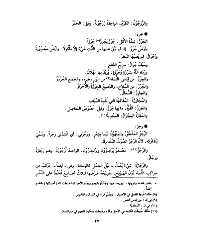 والزَّرَجُوْنُ : الكَرْمُ ، الواحِدَةُ زَرَجُوْنَةٌ . وقيل : الخَمْرُ . جرز : الجَرْزُ : شِدَّةُ الأكْلِ ، جَرَزَ يجْرِزُ جَرْزاً . وأرْضٌ جُرُزٌ : إذا لم يَبْقَ عليها من النَّبْتِ شَيْءٌ إلاّ مأْكُولاً . وأرْضٌ مَجْرُوزَةٌ وأجْرَازٌ : لم يُصِبْهَا المَطَرُ . وسَيْفٌ جُرَازٌ : سَرِيْعُ القَطْعِ . ورَمَاه اللَّهُ بشَرْزَةٍ وَجَرْزَةٍ : يُريْدُ بها الهَلاَكَ . والجِرْزُ من لِبَاسِ النِّسَاء من الوَبَرِ وغيره ، والجميع الجُرُوْزُ . والجُرْزُ : من السِّلاح ، والجَميعُ الجِرَزَةُ والأجْرَازُ . والجارِزُ : السُّعَالُ . والمُجَارَزَةُ : المُفَاكَهَةُ التي تُشْبِهُ السِّبَابَ . والجَرَزُ : القُوَّةُ ، ما بها جَرَزٌ . وقيل : فُصُوصُ المَفَأصِلِ . والَمفَازَةُ المِجْزَارُ : المُجْدِبَةُ . رجز : الرَّجْزُ المَشْطُُوْرُ والمَنْهُوْكُ لَيْسا بشِعْرٍ . ورَجِّزْني : أي أنْشِدْني رَجَزاً . وسُمِّيَ لِتَدَارُكِه ، لأنَّ الرَّجَزَ الصَّوْتُ المُتَدَارِكُ . والرَّجَزُ : مَصْدَرُ يَرْجُزُوْنَ ويَرْتَجِزُوْنَ ، الواحِدُ أُرْجُوْزَةٌ . وهو رَجّازَةٌ ورَجّازٌ . والرِّجَازِةُ : شَيْءٌ يُعْدَلُ به مَيْلُ الحِمْلِ كالوِسَادَة . وهي أيضاً : مَرْكَبٌ من مَرَاكِبِ النِّسَاءِ دُوْنَ الهَوْدَج . ونَسِيْجَةٌ عَرْضُها ثلاث أصابِعَ تُخَيَّطُ على السَّتْرِ