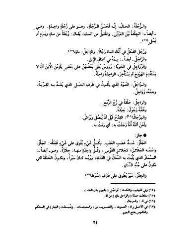 والزُّجْلَةُ : الحالُ ، إِنَّه لَحَسَنُ الزُّجْلَةِ ، وهو على زُجْلَةٍ واحِدَةٍ . وهي أيضاً : الجِلْدَةُ بَيْنَ العَيْنَيْن . والقَليلُ من الماءِ ، يُقال : زُجْلَةٌ من ماءٍ وبَرَدٍ أو نَخْلٍ . وزَجَلَ الفَحْلُ في أُنْثَاه الماءَ زَجْلاً . والزاجِلُ : ماؤه . والزّاجَلُ أيضاً : سِمَةٌ في أعناقِ الإِبل . والزَّوَاجِلُ في الحَويَّةِ : رؤوس يُثْنى بَعْضُهُنَّ على بَعْضٍ يَلْزَمْنَ الأُبَنَ أنْ لا يَسْتَقْدِم الهَوْدَجَ أو يَسْتَأْخِرَ ، الواحِدَةُ زاجِلةٌ . والزّاجِلُ : العُوْدُ الذي يكُونُ في طَرَفِ الحَبْلِ الذي يُشِدُّ به القِرْبَةُ ، وجَمْعُه زَوَاجِلُ . والزاجِلُ : حَلْقَةٌ في زُجِّ الرُّمْحِ . وعُقْبَةٌ زَجُوْلٌ : بَعيْدَةٌ . والمِزْجَالُ : القِدْحُ قَبْلَ أنْ يُنَصَّلَ ويُرَاشَ . ولَعَنَ اللّهُ أُمّا زَجَلَتْ به : أي رَمَتْ به . جلز : الجَلْزُ : شَدُّ عَصَبِ العَقَبِ . وكُلُّ شَيْءٍ يُلْوى على شَيْءٍ فَفِعْلُه : الجَلْزُ ، واسْمُه الجَلاَئزُ ؛ كجَلائزِ القَوْسِ ، وكُلُّ واحِدَةٍ منها : جِلاَزَةٌ . وهو أيضاً : المِسْمَارُ الذي يُثِبَتُ به السِّنَانُ في القناةِ ؛ ورُبَّما كانَ سَيْراً ، وتكون الحَلَقَةَ التي تكونُ على جُبَّةِ السِّنَانِ . والجِلْزُ : سَيْرٌ يُطْوى على طَرَفِ السَّوْط .