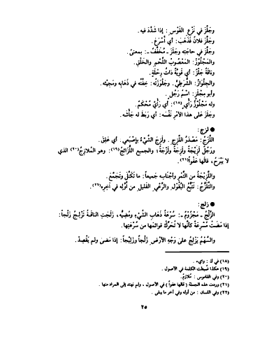 وجَلَّزَ في نَزعِ القَوْسِ : إذا شَدَّدَ فيه . وجَلَّزَ فلانٌ فَذهَبَ : أي أّسْرَعَ . وجَلَّزَ في حاجَتِه وجَلَزَ مُخَفَّفٌ : بمعنىَّ . والمَجْلُوْز : المَعْصُوبُ اللَّحْمِ والخَلْقِ . وناقَةٌ جَلْزٌ : أي قَوِيَّةٌ ذاتُ رِحْلَةٍ . والجِلْوَازُ : الشُّرَطيُّ . وجَلْوَزَتْه : خِفَّتُه في ذَهَابِه ومَجِيْئه . وأبو مِجْلَز : اسْمُ رَجُلٍ . وله مَجْلُوَّزُ رَأْيٍ : أي رَأْيٌ مُحْكَمٌ . وجَلَزَ على هذا الأمْرِ نَفْسَه : أي رَبَطَ له جَأشَه . لزج : اللَّزَجُ : مَصْدَرُ اللَّزِجِ . ولَزِجَ الشَّيْءُ بإِصْبَعي : أي عَلِقَ . ورَجُلٌ لَزِيْجَةٌ ولَزِجَةٌ ولَزْجَةٌ ؛ والجميع اللُّزَائجُ : وهو المُلازِجُ الذي ل يَبْرَحُ ، قالَها عَفْواً . واللَّزِيْجَةُ من التَّمْرِ وأجْنَاسِه جَميعاً : ما تَكَتَّلَ وتَجَمَّعَ . والتَّلَزُّجُ : تَتَبُّعُ البُقُوْلِ والرَّعْيِ القَليلِ من أوَّله في آخِرِه . زلج : الزَّلْجُ مَجْزُوْمٌ : سُرْعَةُ ذَهَابِ الشَّيْءِ ومُضِيُّه ، زَلَجَتِ الناقَةُ تَزْلِجُ زَلْجاً : إذا مَضَتْ مُسْرِعةً كأنَّها لا تُحَرَّكُ قوائمَها من سُرْعَتِها . والسَّهْمُ يَزْلُجُ على وَجْهِ الأرْضِ زَلْجاً وزَلِيْجاً : إذا مَضى ولم يَقْصِدْ .