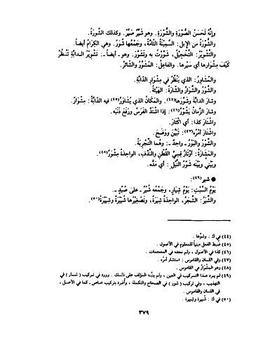 وإِنَّهُ لَحَسَنِ الصُّوْرَةِ والشُّوْرَةِ . وهو شَيِّرٌ وصَيِّرٌ . وكذلك الشَّورَةُ . والشَّوْرَةُ من الإِبل : السَّمِيْنَةُ التّامَّةُ ، وجَمْعُها شُوْرٌ . وهي الكِرَامُ أيضاً . والتَّشْوِيْرُ : التَّخْجِيْلُ ، شَوَّرْتُ به وتَشَوَّرَ . وهو أيضاً : تَشْوِيْرُ الدابَّةِ تَنْظُرُ كَيْفَ مِشْوَارها أي سَيْرها . والفاعِلُ : المُشَوَّرُ والشّائرُ . والمُشَاوِرُ : الذي يَنْظُرُ في مِشْوَارِ الدّابَّةِ . والشَّوْرُ والشَّوَارُ والشّارَةُ : الهَيْئَةُ . وشارَ الدابَّةَ وشَوَّرَها . والمَكَانُ الذي يُشَاوَرُ فيه الدّابَّةُ : مِشْوَارٌ . وشارَ الزَّمانُ يَشُوْرُ : إذا اشْتَدَّ الفَرَسُ ورَفَعَ ذَنَبَه . واشْتَارَ كذا : أي اكْتَارَ . واشْتَارَ أمْرُه : تَبَيَّنَ ووَضَحَ . والشَّوْرُ والبَوْرُ واحِدٌ : وهُما التَّجْرِبَةُ . والمَشَارَةُ : أوْتَارُ قِسِيِّ القُطْنِ والنَّدْفِ ، الواحِدَةُ مِشْوَرٌ . وبَيْني وبَيْنَه شَوْرُ النَّبْلِ : أي مَدَّه ، شير : يَوْمُ السَّبْتِ : يَوْمُ شِيَارٍ ، وجَمْعُه شُيُرٌ على صُيُدٍ . والشَّيَرُ : الشّجَرُ ، الواحِدَةُ شِيَرَةٌ وتصغيرها وشِيَيْرَةٌ .