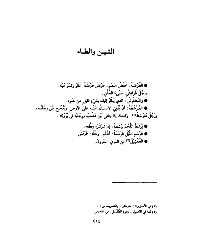 الطَّرْفَشَةُ : خَفْضُ البَصَرِ ، طَرْفَشَ طَرْفَشَةً : نَظَرَ وكَسَرَ عَيْنَه . ورَجُلٌ طُرَافِشٌ : سَيِّىءُ الخُلُقِ . والمُطَرفِشُ : الذي يَنْظُرُ إليكَ بشَيْءٍ قَليلٍ من بَصَرِه . الفَرْطَشَةُ : أنْ يُلْقِيَ الانسانُ اسْتَه على الأرْضِ ويُفَحِّجَ بَيْنَ رِجْلَيْه . ورَجُلٌ مُفَرْشِطٌ . وكذلك إذا جافى بَيْنَ عَضُدَيْه ورِجْلَيْه في بُرُوْكِه . بَرْشَطَ اللَّحْمَ بَرْشَطَةً : إذا شَرْشَرَه وقَطَّعه . طَرْشَمَ اللَّيْلُ طَرْشَمَةً : أظْلَمَ . ومِثْلُه : طَرْمَشَ . الطَّفْشِيْلُ من المَرَقِ : مَعْروفٌ .