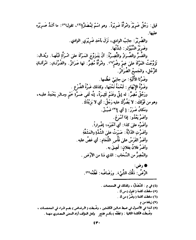 قيل : رَجُلٌ ضَرِيْرٌ وامْرَأَةٌ ضَرِيْرَةٌ . وهو اسْمُ لِمُضَارَّةٍ ، تقول : ما أشَدَّ ضَرِيْرَه عليها . والضَّرِيْرُ : جانِبُ الوادي ، نَزَلَ بأحَدِ ضَرْيْرَيِ الوادي . وضَرِيْرُ السُّيُوْلِ : شِدَّتُها . والضَّرُّ والضِّرَارُ والتَّضِرَّةُ : أنْ يَتَزَوَّجَ المَرْأَةَ على امْرَأَةٍ قَبْلَها . ويُقال : تَزَوَّجَتُ المَرْأةَ على ضِرٍّ وضُرٍّ . وامْرَأَةٌ مَضِرٍّ : لها ضَرَائرُ . والضَّرَّتَانِ : امْرَأتانِ للرَّجُل ، والجَميعُ الضَّرَائرُ . وضَرَّتا الأَلْيَةِ : من جانِبَيْ عَظْمها . وضَرَّةُ الإِبْهَامِ : لَحْمَةٌ تَحْتَها ، وكذلك ضَرَّةُ الضَّرْعِ . ورَجُلٌ مُضِرُّ ٌ : له إِبلٌ وغَنَمٌ كَثِيرَةٌ ، إنَّه لَفي ضَرَّةِ خَيْرٍ ومالٍ يَعْتَمِدُ عليه ، وهو من قَوْلِكَ : لا يَضُرُّ : َ عليه رَجُلٌ : أي لا يَزِيْدُكَ . ومَكانٌ ضَرَرٌ : [ أي ] ضَيِّقٌ . وأضَرَّ يَعْدُو : إذا أسْرَعَ . وأضَرَّه على كذا : أي أجْبَرَه ؛ إضْراراً . وأضَرَّتِ الدّابَّةُ : صَبَرَتْ على الشِّدَّةِ والمَشَقَّةِ . وأضَرَّ الفَرَسُ على فأْسِ اللِّجَام : أي عَضَّ عليه . وأضَرَّ فلانٌ بفلانٍ : لَصِقَ به . والمُضِرُّ من السَّحَاب : الذي دّنا من الأرْضِ . رض : الرَّضُّ : دَقُّكَ الشَّيْءَ . ورَضَاضُه : قَطْعُه .