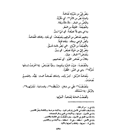 ونَضَّ إلَيَّ من مَعْرُوْفِه نُضَاضَةٌ . وأصابَهُ نّضٌّ من الأمْرِ : أي مَكْرُوْهٌ . والنّاضُّ من المالِ : مالَهُ مادَّةٌ وبَقَاءٌ . والنَّضِيْضَةُ : القَلِيلَةُ من المَطَرِ . وما في يدي إلاّ نَضِيْضَةٌ : أي شَيْءٌ يَسِيْرٌ . وعليهم نَضَائضُ من أمْوالِهِم ونَضِيْضَاتٌ : أي بَقَايا ، وكذلك النُّضَاضَةُ . وأنّضَّ الراعي سِخَالَه : سَقَاها قَليلاً . والنَّضِيْضَةُ من الرِّيَاحِ : التي تَنِضُّ بالماءِ فَيَسِيْلُ . ونَضَّ إليَّ من خَيْرِكَ نَضِيْضٌ : أي يَسِيْرٌ . ونُضَاض المالِ : خِيَارُه . وفلانٌ من نُضَاضِ القَوْمِ : أي مُصَاصِهم . والنَّضْنَضَةُ : صَوْتُ الحَيَّةِ ونَحْوِها ، وحَيَّةٌ نَضْنَاضٌ : إذا أخْرَجَتْ لِسَانَها تُحَرِّكُه . وهي في العَيْنِ : الظَّفَرَةُ . ونُضَاضَةُ الرَّجُلِ : آخِرُ وَلَدِه ، وكذلك نُضَاضَةُ الماءِ : بَقِيَّتُه ، والجَميعُ نُضَاضَاتٌ . وتَنَضْنَضْتُ حَقّي من فلانٍ : اسْتَنْظَفْته ، والحاجَةَ : تَنَجَّزْتها ، والرَّجُلَ : إذا اسْتَحْثَثْته . وأنْضَضْتُ الحاجَةَ إنْضَاضاً : أنْجَزْتها .