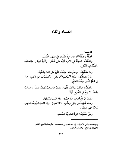 ضف : الضَّفَّةُ والضُّفَّةُ : جانِبا البِئْرِ اللَّذَانِ تَقَعُ عليهما النَّبَائثُ . والضَّفَفُ : العَجَلَةُ في الأمْرِ ، لَقِيْتُع على ضَفَفٍ . وكَثْرَةُ العِيَالِ . والحاجَةُ والضِّيْقُ في العَيْشِ . وماءٌ مَضْفُوْفٌ : مُزْدَحَمٌ عليه ، وضَفَّ القَوْمُ على الماء يَضْفُّونَ . وقَوْمٌ مُتَضَافُّوْنَ : خَفِيْفَةٌ أحْوَالُهم . وقيل : مُجْتَمِعُوْنَ ، من قَوْلهم : جاءَ في ضَفَّةِ النّاس ِوضَفَّةِ الحاجُّ . والضَّفُّ : الحَلبُ بالكَفِّ كُلِّها ، وضَفَّ الحالِب يَضُفُّ ضَفّاً . وحالِبٌ مضَفٌّ : لا يَدَعُ في الضَّرْعِ شَيْئاً . وضَفَّ الرَّجُلُ أصابِعَه عِنْدَ الصَّلاَء . إذا جَمَعَها وبَسَطَها . وهذه ضَفِيْفَةٌ من بَقْلٍ وعُشْبٍ 246 ب . وإذا كانتِ الرَّوْضَةُ ناضِرَةً مُتَخَّليَةً فهي ضَفِيْفَةٌ . وعَيْنٌ ضَفُوْفٌ : كثيرةُ الماءِ بَيَّنَةُ الضِّفَافِ .
