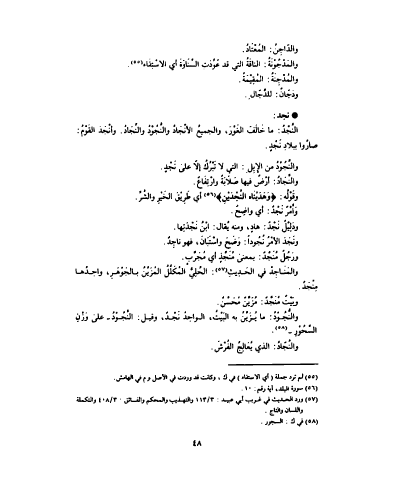 والدّاجِنُ : المُعْتَادُ . والمَدْجُوْنَةُ : الناقَةُ التي قد عُوِّدَتِ السِّنَاوَةَ أي الاسْتِقَاء . والمُدْجِنَةُ : المُقِيْمَةُ . ودَجّان : للدَّجّالِ . نجد : النَّجْدُ : ما خَالَفَ الغَوْرَ ، والجميعُ الأنْجَادُ والنَّجُوْدُ والنَّجَادُ . وأنْجَدَ القَوْمُ : صارُوا ببلادِ نَجْدٍ . والنَّجُوْدُ من الإِبِلِ : التي لا تَبْرُكُ إلاّ على نَجْدٍ . و النِّجَادُ : أرْضٌ فيها صَلاَبَةٌ وارْتِفَاعٌ . وقَوْلَه : ' وَهَدَيْنَاه النَّجْدَيْنِ ' أي طَرَيْقَ الخَيْرِ والشَّرِّ . وَ أَمْرٌ نَجْدٌ : أي واضِحٌ . ودَلِيْلٌ نَجْدٌ : هادٍ ، ومنه يُقال : ابْنُ نَجْدَتِها . ونَجَدَ الأمْرُ نُجُوداً : وَضَحَ واسْتَبَانَ ، فهو ناجِدٌ . ورَجُلٌ مُنْجَّدٌ : بمعنى مُنَجَّذٍ أي مُجَرَّبٍ . والمَنَاجِدُ في الحَدِيثِ : الحُلِيُّ المُكَلَّلُ المُزَيَّنُ بالجَوْهَرِ ، واحِدُهما مِنْجَدٌ . وبَيْتٌ مُنْجَّدٌ : مُزَيَّنٌ مُحَسَّنٌ . والنُّجُوْدُ : ما يُزَيَّنُ به البَيْتُ ، الواحِدُ نَجْدٌ ، وقيل : النَّجُوْدُ على وَزْنِ السَّجُوْرِ . والنَّجّادُ : الذي يُعَالِجُ الفُرْشَ .