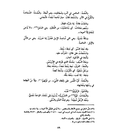 والنَجْدُ : الماضي في أمْرِه وشَجَاعَتِه ، وهم أنْجَادٌ . والنَجْدَةُ : الشَّجَاعَةُ والبُلُوْغُ في الأمْرِ . واسْتَنْجَدَ فُلانٌ : صارَ مُنَاجِداً نَجْداً ؛ فأنْجَدَني . وناجَدْتُ فلاناً : إذا بارَزْتُه القِتَالَ . وبَيْنَهم نِجَادَاتٌ : أي يَتَنَاجَدُوْنَ ؛ من التَّعَاوُنِ . وفي المَثَل : ' لا يُدْعَى لِنَجْدَةٍ إلاّ أخوها ' . وناقَةٌ نَجُوْدٌ : وهي التي تُنَاجِدُ الإِبِلَ فَتَعْزُزُ إذا غَزَزنَ . وهي من الأُتْنِ والإِبِلِ : الماضِيَةُ . وقد نَجِدَ للسَّيْرِ : أي نَشِطَ ؛ يَنْجَدُ . واسْتَنْجَدْتُ على فلانٍ : اجْتَرأْتُ عليه . و أنْجَدَ في الدَّعْوَةِ : أجابَ . ونِجَادُ السَّيْفِ : مِحْمَلُه الذي طَرفاه في الإِبْزِيْمَيْنِ والنجد : العرق نجد ينجد نجداً وجمعه نجاد . ورَجُلٌ مَنْجُوْدٌ : أي مَكْرُوْبٌ ، ومُنْجَدٌ أيضاً . ونَجِدَ : إذا تَعِبَ ، ونَجُدَ مِثْلُه . والنَّجْدَةُ : كُرْعُ النَّفْسِ على إعْطاءِ الشَّيْءِ ، من قَوْلِهمْ : ' إلاّ مَنْ أعْطاها في رِسْلِها ونَجْدَتِها ' . و النّاجُوْدُ : الرّاوُوْقُ نَفْسُه . و النَّجَدَاتُ : قَوْمٌ من الحَرُوْرِيَّةِ ؛ يُنْسَبُونَ إلى نَجْدَةَ ، الواحِدُ نَجْدِيٌّ . ونَجَّدَ الرَّجُلُ تَنْجِيْداً : وهو شِدَّةُ العَدْوِ والسَّعْيِ .