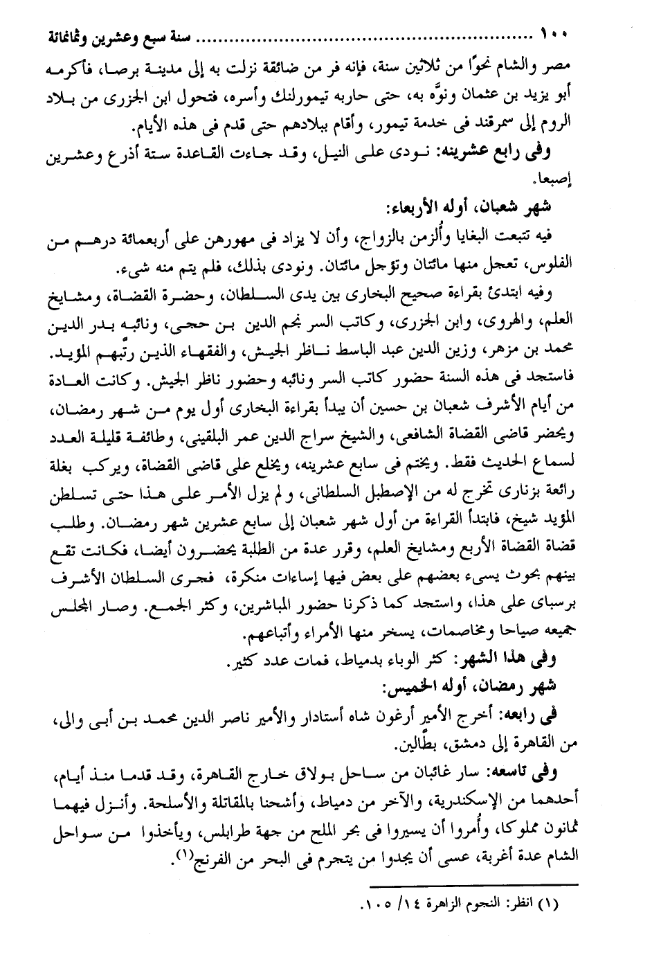 مصر وَالشَّام نَحوا من ثَلَاثِينَ سنة فَإِنَّهُ فر من ضائقة نزلت بِهِ إِلَى مَدِينَة برصا فَأكْرمه أَبُو يزِيد بن عُثْمَان ونوه بِهِ حَتَّى حاربه تيمورلنك وأسره فتحول ابْن الْجَزرِي من بِلَاد الرّوم إِلَى سَمَرْقَنْد فِي خدمَة تيمور وَأقَام ببلادهم حَتَّى قدم فِي هَذِه الْأَيَّام. وَفِي رَابِع عشرينه: نُودي على النّيل وَقد جَاءَت الْقَاعِدَة سِتَّة أَذْرع وَعشْرين إصبعاً. شهر شعْبَان أَوله الْأَرْبَعَاء: فِيهِ تتبعت البغايا وألزمن بالزواج وَأَن لَا يُزَاد فِي مهورهن على أَرْبَعمِائَة دِرْهَم من الْفُلُوس تعجل مِنْهَا مِائَتَان وتؤجل مِائَتَان. وَنُودِيَ بذلك فَلم يتم مِنْهُ شَيْء. وَفِيه ابتدئ بِقِرَاءَة صَحِيح البُخَارِيّ بَين يَدي السُّلْطَان وحضرة الْقُضَاة ومشايخ الْعلم والهروي وَابْن الْجَزرِي وَكَاتب السِّرّ نجم الدّين بن حجي ونائبه بدر الدّين مُحَمَّد بن مزهر وزين الدّين عبد الباسط نَاظر الْجَيْش وَالْفُقَهَاء الَّذين رتبهم الْمُؤَيد. فاستجد فِي هَذِه السّنة حُضُور كَاتب السِّرّ ونائبه وَحُضُور نَاظر الْجَيْش. وَكَانَت الْعَادة من أَيَّام الْأَشْرَف شعْبَان بن حُسَيْن أَن يبْدَأ بِقِرَاءَة البُخَارِيّ أول يَوْم من شهر رَمَضَان ويحضر قَاضِي الْقُضَاة الشَّافِعِي وَالشَّيْخ سراج الدّين عمر البُلْقِينِيّ وَطَائِفَة قَليلَة الْعدَد لسَمَاع الحَدِيث فَقَط. وَيخْتم فِي سَابِع عشرينه ويخلع على قَاضِي الْقُضَاة ويركب بغلة رائعة بزناري تخرج لَهُ من الاصطبل السلطاني وَلم يزل الْأَمر على هَذَا حَتَّى لسلطن الْمُؤَيد شيخ فابتدأ الْقِرَاءَة من أول شهر شعْبَان إِلَى سَابِع عشْرين شهر رَمَضَان. وَطلب قُضَاة الْقُضَاة الْأَرْبَع ومشايخ الْعلم وَقرر عدَّة من الطّلبَة يحْضرُون أَيْضا فَكَانَت تقع بَينهم بحوث يسيء بَعضهم على بعض فِيهَا إساءات مُنكرَة فَجرى السُّلْطَان الْأَشْرَف برسباي على هَذَا واستجد كَمَا ذكرنَا حُضُور المباشرين وَكثر الْجمع. وَصَارَ الْمجْلس جَمِيعه صياحاً ومخاصمات يسخر مِنْهَا الْأُمَرَاء وأتباعهم. وَفِي هَذَا الشَّهْر: كثر الوباء بدمياط فَمَاتَ عدد كثير. شهر رَمَضَان أَوله الْخَمِيس: وَفِي رابعه: أخرج الْأَمِير أرغون شاه أستادار والأمير نَاصِر الدّين مُحَمَّد بن أبي وافي من الْقَاهِرَة إِلَى دمشق بطالين. وَفِي تاسعه: سَار غائبان من سَاحل بولاق خَارج الْقَاهِرَة وَقد قدما مُنْذُ أَيَّام أَحدهمَا من الْإسْكَنْدَريَّة وَالْآخر من دمياط وأشحنا بالمقاتلة والأسلحة. وَأنزل فيهمَا ثَمَانُون مَمْلُوكا وَأمرُوا أَن يشيروا فِي بَحر الْملح من جِهَة طرابلس ويأخذوا من سواحل الشَّام عدَّة أغربة عَسى أَن يَجدوا من يتجرم فِي الْبَحْر من الفرنج.
