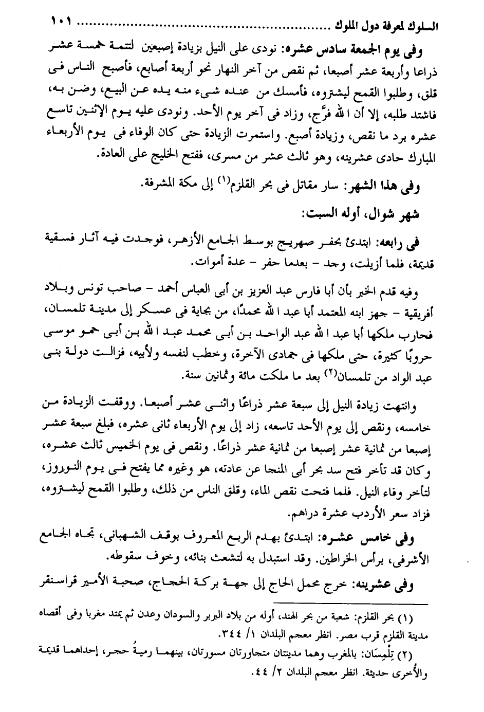 وَفِي يَوْم الْجُمُعَة سادس عشره: نُودي على النّيل بِزِيَادَة إِصْبَعَيْنِ لتتمة خَمْسَة عشر ذِرَاعا وَأَرْبَعَة عشر لإصبعاً ثن نقص من آخر النَّهَار نَحْو أَرْبَعَة أَصَابِع فَأصْبح النَّاس فِي قلق وطلبوا الْقَمْح لِيَشْتَرُوهُ فَأمْسك من عِنْده شَيْء مِنْهُ يَده عَن البيع وضن بِهِ فَاشْتَدَّ طلبه إِلَّا أَن الله فرج وَزَاد فِي آخر يَوْم الْأَحَد. وَنُودِيَ عَلَيْهِ يَوْم الِاثْنَيْنِ تَاسِع عشره برد مَا نقص وَزِيَادَة إِصْبَع. واستمرت الزِّيَادَة حَتَّى كَانَ الْوَفَاء فِي يَوْم الْأَرْبَعَاء الْمُبَارك حادي عشرينه وَهُوَ ثَالِث عشر من مسرى فَفتح الخليج على الْعَادة. وَفِي هَذَا الشَّهْر: سَار مقَاتل فِي بَحر القلزم إِلَى مَكَّة المشرفة. شهر شَوَّال أَوله السبت: فِي رابعه: ابتدئ بِحَفر صهريج بوسط الْجَامِع الْأَزْهَر فَوجدت فِيهِ أثار فسقية قديمَة فَلَمَّا أزيلت وجد - بعد مَا حفر - عدَّة أموات. وَفِيه قدم الْخَيْر بِأَن أَبَا فَارس عبد الْعَزِيز بن أبي الْعَبَّاس أَحْمد - صَاحب تونس وبلاد إفريقية - جهز ابْنه الْمُعْتَمد أَبَا عبد الله مُحَمَّدًا من بجاية فِي عَسْكَر إِلَى مَدِينَة تلمسان فحارب ملكهَا أَبَا عبد الله عبد الْوَاحِد بن أبي مُحَمَّد عبد الله بن أبي حمو مُوسَى حروباً كَثِيرَة حَتَّى ملكهَا فِي جُمَادَى الْآخِرَة وخطب لنَفسِهِ ولأبيه فَزَالَتْ دولة بني عبد الواد من تلمسان بعد مَا ملكت مائَة وَثَمَانِينَ سنة. وانتهت زِيَادَة النّيل إِلَى سَبْعَة عشر ذِرَاعا واثني عشر إصبعاً. ووقفت الزِّيَادَة خامسه وَنقص إِلَى يَوْم الْأَحَد تاسعه زَاد إِلَى يَوْم الْأَرْبَعَاء ثَانِي عشره فَبلغ سَبْعَة عشر إصبعاً من ثَمَانِيَة عشر إصبعاً من ثَمَانِيَة عشر ذِرَاعا. وَنقص فِي يَوْم الْخَمِيس ثَالِث عشره وَكَانَ قد تَأَخّر فتح سد بَحر أبي المنجا عَن عَادَته هُوَ وَغَيره مِمَّا يفتح فِي يَوْم النوروز لتأخر وَفَاء النّيل. فَلَمَّا فتحت نقص المَاء وقلق النَّاس من ذَلِك وطلبوا الْقَمْح لِيَشْتَرُوهُ فَزَاد سعر الأردب عشرَة دَرَاهِم. وَفِي خَامِس عشره: ابتدئ بهدم الرّبع الْمَعْرُوف بوقف الشهباني تجاه الْجَامِع الأشرفي بِرَأْس الخراطين. وَقد استبدل بِهِ لتشعث بنائِهِ وَخَوف سُقُوطه. وَفِي عشرينه: خرج محمل الْحَاج إِلَى جِهَة بركَة الْحجَّاج صُحْبَة الْأَمِير قرا سنقر