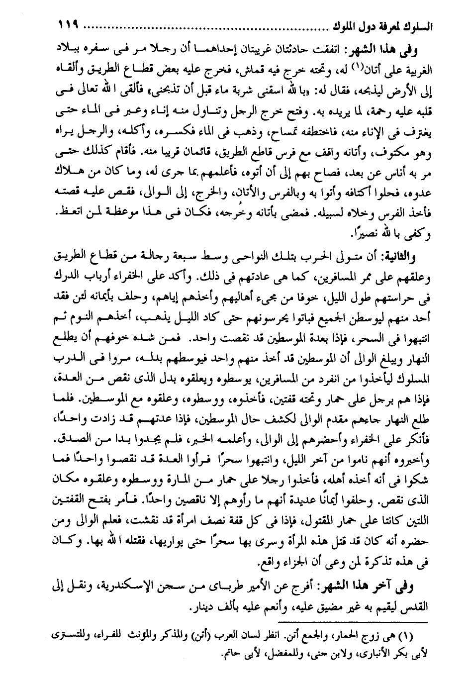 وَفِي هَذَا الشَّهْر: اتّفقت حادثتان غريبتان إِحْدَاهمَا أَن رجلا مر فِي سَفَره بِبِلَاد الغربية على أتان لَهُ وَتَحْته خرح فِيهِ قماش فَخرج عَلَيْهِ بعض قطاع الطَّرِيق وَألف إِلَى الأَرْض ليذبحه فَقَالَ لَهُ: بِاللَّه اسْقِنِي شربة مَاء قبل أَن تذبحني فَألْقى الله تَعَالَى فِي قلبه عَلَيْهِ رَحْمَة لما يُريدهُ بِهِ. وَفتح خرج الرجل وَتَنَاول مِنْهُ إِنَاء وَعبر فِي المَاء حَتَّى يغترف فِي الْإِنَاء مِنْهُ فاختطفه تمساح وَذهب فِي المَاء فَكَسرهُ وَأكله وَالرجل يرَاهُ وَهُوَ مكتوف وأتانه وَاقِف مَعَ فرس قَاطع الطَّرِيق قائمان قَرِيبا مِنْهُ. فَأَقَامَ كَذَلِك حَتَّى مر بِهِ أنَاس عَن بعد فصاح بهم إِلَى أَن أَتَوْهُ فأعلمهم بِمَا جرى لَهُ وَمَا كَانَ من هَلَاك عدوه فحلوا أكتافه وَأتوا بِهِ وبالفرس والأتان والخرج إِلَى الْوَالِي فَقص عَلَيْهِ قصَّته فَأخذ الْفرس وخلاه لسبيله. فَمضى بأتانه وخرجه فَكَانَ فِي هَذَا موعظة لمن اتعظ وكفي بِاللَّه نَصِيرًا. وَالثَّانيَِة: أَن مُتَوَلِّي الْحَرْب بِتِلْكَ النواحي وسط سَبْعَة رجالة من قطاع الطَّرِيق وعلقهم على ممر الْمُسَافِرين كَمَا هِيَ عَادَتهم فِي ذَلِك. وأكد على الخفراء أَرْبَاب الدَّرك فِي حراستهم طول اللَّيْل خوفًا من مَجِيء أَهَالِيهمْ وَأَخذهم إيَّاهُم وَحلف بأيمانه لَئِن فقد أحد مِنْهُم ليوسطن الْجَمِيع فَبَاتُوا يَحْرُسُونَهُمْ حَتَّى كَاد اللَّيْل يذهب أَخذهم النّوم ثمَّ أنتبهوا فِي السحر فَإِذا بعدة الموسطين قد نقصت وَاحِد. فَمن شدَّة خوفهم أَن يطلع النَّهَار ويبلغ الْوَالِي أَن الموسطين قد أَخذ مِنْهُم وَاحِد فيوسطهم بدله مروا فِي الدَّرْس المسلوك ليأخذوا من انْفَرد من الْمُسَافِرين يوسطوه ويعلقوه بدل الَّذِي نقص من الْعدة فَإِذا هم بِرَجُل على حمَار وَتَحْته قفتين فَأَخَذُوهُ ووسطوه وعلقوه مَعَ الموسطين. فَلَمَّا طلع النَّهَار جَاءَهُم مقدم الْوَالِي لكشف حَال الموسطين فَإِذا عدتهمْ قد زَادَت وَاحِدًا فَأنْكر على الخفراء وأحضرهم إِلَى الْوَالِي وأعلمه الْخَيْر فَلم يَجدوا بدا من الصدْق وَأَخْبرُوهُ أَنهم نَامُوا آخر اللَّيْل وانتبهوا سحرًا فَرَأَوْا الْعدة قد نَقَصُوا وَاحِدًا فَمَا شكوا فِي أَنه أَخذه أَهله فَأخذُوا رجلا على حمَار من الْمَارَّة ووسطوه وعلقوه مَكَان الَّذِي نقص. وحلفوا أيماناً عديدة أَنهم مَا رَأَوْهُمْ إِلَّا ناقصين وَاحِدًا. فَأمر بِفَتْح القفتين اللَّتَيْنِ كَانَتَا على حمَار الْمَقْتُول فَإِذا فِي كل قفة نصف امْرَأَة قد نقشت فَعلم الْوَالِي وَمن حَضَره أَنه كَانَ قد قتل هَذِه الْمَرْأَة وسرى بهَا سحرًا حَتَّى يواريها فَقتله الله بهَا. وَكَانَ فِي هَذِه تذكرة لمن وعي أَن الْجَزَاء وَاقع. وَفِي آخر هَذَا الشَّهْر: أفرج عَن الْأَمِير طرباي من سجن الْإسْكَنْدَريَّة وَنقل إِلَى الْقُدس ليقيم بِهِ غير مضيق عَلَيْهِ وأنعم عَلَيْهِ بِأَلف دِينَار.
