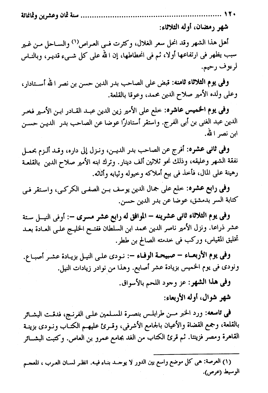 شهر رَمَضَان، أَوله الثُّلَاثَاء: أهل هَذَا الشَّهْر وَقد انحل سعر الغلال وَكَثُرت فِي العراص والساحل من غير سَبَب يظْهر فِي ارتفاعها أَولا ثمَّ فِي انحطاطها إِن الله على كل شَيْء قدير وبالناس لرءوف رَحِيم. وَفِي يَوْم الثُّلَاثَاء ثامنه: قبض على الصاحب بدر الدّين حسن بن نصر الله أستادار وعَلى وَلَده الْأَمِير صَلَاح الدّين مُحَمَّد وعوقا بالقلعة. وَفِي يَوْم الْخَمِيس عاشره: خلع على الْأَمِير زين الدّين عبد الْقَادِر ابْن الْأَمِير فَخر الدّين عبد الْغَنِيّ بن أبي الْفرج. وَاسْتقر أستادارا عوضا عَن الصاحب بدر الدّين حسن ابْن نصر الله. وَفِي ثَانِي عشره: أفرج عَن الصاحب بدر الدّين وَنزل إِلَى دَاره وَقد ألزم بِحمْل نَفَقَة الشَّهْر وعليقه وَذَلِكَ نَحْو ثَلَاثِينَ ألف دِينَار. وَترك ابْنه الْأَمِير صَلَاح الدّين بالقلعة رهينة على المَال فَأخذ فِي بيع أملاكه وخيوله وثيابه وأثاثه. وَفِي رَابِع عشره: خلع على جمال الدّين يُوسُف بن الصفي الكركي وَاسْتقر فِي كِتَابَة السِّرّ بِدِمَشْق عوضا عَن بدر الدّين حسن. وَفِي يَوْم الثُّلَاثَاء ثَانِي عشرينه - الْمُوَافق لَهُ رَابِع عشر مسرى -: أوفي النّيل سِتَّة عشر ذِرَاعا. وَنزل الْأَمِير نَاصِر الدّين مُحَمَّد ابْن السُّلْطَان فَفتح الخليج على الْعَادة بعد تخليق المقياس وَركب فِي خدمته الصَّالح بن ططر. وَفِي يَوْم الْأَرْبَعَاء - صَبِيحَة الْوَفَاء -: نُودي على النّيل بِزِيَادَة عشر أصباع. وَنُودِيَ فِي يَوْم الْخَمِيس بِزِيَادَة عشر أَصَابِع. وَهَذَا من نَوَادِر زيادات النّيل. وَفِي هدا الشَّهْر: عز وجود اللَّحْم بالأسواق. شهر شَوَّال أَوله الْأَرْبَعَاء: فِي تاسعه: ورد الْخَبَر من طرابلس بنصرة الْمُسلمين على الفرنج فدقت البشائر بالقلعة وَجمع الْقُضَاة والأعيان بالجامع الأشرفي وَقُرِئَ عَلَيْهِم الْكتاب وَنُودِيَ بزينة الْقَاهِرَة ومصر فزينتا. ثمَّ قرئَ الْكتاب من الْغَد بِجَامِع عَمْرو بن الْعَاصِ. وكتبت البشائر