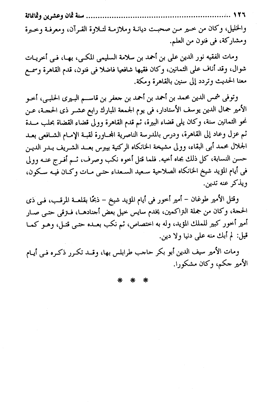 والخليل وَكَانَ من خير من صَحِبت ديانَة وملازمة لتلاوة الْقُرْآن وَمَعْرِفَة وخبرة ومشاركة فِي فنون من الْعلم. وَمَات الْفَقِيه نور الدّين عَليّ بن أَحْمد بن سَلامَة السليمي الْمَكِّيّ بهَا فِي أخريات شَوَّال وَقد أناف على الثَّمَانِينَ وَكَانَ فَقِيها شافعياً فَاضلا فِي فنون قدم الْقَاهِرَة وَسمع مَعنا الحَدِيث وَتردد إِلَى سنَن بِالْقَاهِرَةِ وَمَكَّة. وَتُوفِّي شمس الدّين مُحَمَّد بن أَحْمد بن أَحْمد بن جَعْفَر بن قَاسم البيري الْحلَبِي أَخُو الْأَمِير جمال الدّين يُوسُف الأستادار فِي يَوْم الْجُمُعَة الْمُبَارك رَابِع عشر ذِي الْحجَّة عَن نَحْو الثَّمَانِينَ سنة وَكَانَ يَلِي قَضَاء البيرة ثمَّ قدم الْقَاهِرَة وَولي قَضَاء الْقُضَاة بحلب مُدَّة ثمَّ عزل وَعَاد إِلَى الْقَاهِرَة ودرس بِالْمَدْرَسَةِ الناصرية الْمُجَاورَة لقبة الإِمَام الشَّافِعِي بعد الْجلَال مُحَمَّد أبي الْبَقَاء ووفي مشيخة الخانكاه الركنية بيبرس بعد الشريف بدر الدّين حسن النسابة كل ذَلِك بجاه أَخِيه. فَلَمَّا قتل أَخُوهُ نكب وَصرف ثمَّ أفرج عَنهُ وَولي فِي أَيَّام الْمُؤَيد شيخ الخانكاه الصلاحية سعيد السُّعَدَاء حَتَّى مَاتَ وَكَانَ فِيهِ سُكُون وَيذكر عَنهُ تدين. وَقتل الْأَمِير طوغان - أَمِير أخور فِي أَيَّام الْمُؤَيد شيخ - ذبحا بقلعة المرقب فِي ذِي الْحجَّة وَكَانَ من جملَة التراكمين يخْدم سايس خيل بعض أجنادها فترقى حَتَّى صَار أَمِير أخور كَبِير للْملك الْمُؤَيد وَله بِهِ اخْتِصَاص ثمَّ نكب بعده حَتَّى قتل وَهُوَ كَمَا قيل: لم أبك مِنْهُ على دنيا وَلَا فِي دين. وَمَات الْأَمِير سيف الدّين أَبُو بكر حَاجِب طرابلس بهَا وَقد تكَرر ذكره فِي أَيَّام الْأَمِير جكم وَكَانَ مشكوراً.