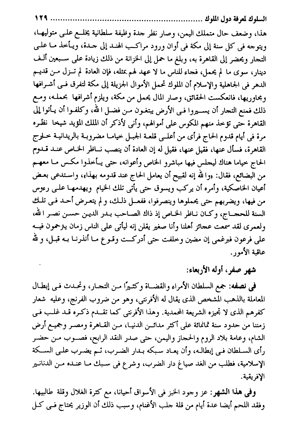 هَذَا وَضعف حَال متملك الْيمن وَصَارَ نظر جدة وَظِيفَة سلطانية يخلع على متوليها وَيتَوَجَّهُ فِي كل سنة إِلَى مَكَّة فِي أَوَان وُرُود مراكب الْهِنْد إِلَى جدة وَيَأْخُذ مَا على التُّجَّار ويحضر إِلَى الْقَاهِرَة بِهِ وَبلغ مَا حمل إِلَى الخزانة من ذَلِك زِيَادَة على سبعين ألف دِينَار سوى مَا لم يحمل فجَاء للنَّاس مَا لَا عهد لَهُم بِمثلِهِ فَإِن الْعَادة لم تزل من قديم الدَّهْر فِي الْجَاهِلِيَّة وَالْإِسْلَام أَن الْمُلُوك تحمل الْأَمْوَال الجزيلة إِلَى مَكَّة لتفرق فِي أَشْرَافهَا ومجاوريها فانعكست الْحَقَائِق وَصَارَ المَال يحمل من مَكَّة وَيلْزم أَشْرَافهَا بِحمْلِهِ وَمَعَ ذَلِك فَمنع التُّجَّار أَن يَسِيرُوا فِي الأَرْض يَبْتَغُونَ من فضل الله وكلفوا أَن يَأْتُوا إِلَى الْقَاهِرَة حَتَّى تُؤْخَذ مِنْهُم المكوس على أَمْوَالهم وَأَنِّي لأذكر أَن الْملك الْمُؤَيد شَيخا نظره مرّة فِي أَيَّام قدوم الْحَاج فَرَأى من أَعلَى قلعة الْجَبَل خياماً مَضْرُوبَة بالريدانية خَارج الْقَاهِرَة فَسَأَلَ عَنْهَا فَقيل عَنْهَا فَقيل لَهُ إِن الْعَادة أَن ينصب نَاظر الْخَاص عِنْد قدوم الْحَاج خياماً هُنَاكَ ليجلس فِيهَا مباشرو الْخَاص وأعوانه حَتَّى يَأْخُذُوا مكس مَا مَعَهم من البضائع فَقَالَ: وَالله إِنَّه لقبيح أَن يُعَامل الْحَاج عِنْد قدومه بِهَذَا واستدعى بعض أَعْيَان الخاصكية وَأمره أَن يركب ويسوق حَتَّى يَأْتِي تِلْكَ الْخيام ويهدمها على رُءُوس من فِيهَا ويضربهم حَتَّى يحملوها وينصرفوا فَفعل ذَلِك وَلم يتَعَرَّض أحد فِي تِلْكَ السّنة للحجاج وَكَانَ نَاظر الْخَاص إِذْ ذَاك الصاحب بدر الدّين حسن نصر الله ولعمري لقد سَمِعت عَجَائِز أهلنا وَأَنا صَغِير يقلن انه ليَأْتِي على النَّاس زمَان يترحمون فِيهِ على فِرْعَوْن فبرغمي إِن مضين وخلفت حَتَّى أدْركْت وُقُوع مَا أنذرنا بِهِ قبل وَللَّه عَاقِبَة الْأُمُور. شهر صفر أَوله الْأَرْبَعَاء: فِي نصفه: جع السُّلْطَان الْأُمَرَاء والقضاة وَكَثِيرًا من التُّجَّار وتحدث فِي إبِْطَال الْمُعَامَلَة بِالذَّهَب المشخص الَّذِي يُقَال لَهُ الأفرنتي وهومن ضروب الفرنج وَعَلِيهِ شعار كفرهم الَّذِي لَا تجيزه الشَّرِيعَة المحمدية. وَهَذَا الأفرنتي كَمَا تقدم ذكره قد غلب فِي زمننا من حُدُود سنة ثَمَانمِائَة على أَكثر مَدَائِن الدُّنْيَا من الْقَاهِرَة ومصر وَجَمِيع أرص الشَّام وَعَامة بِلَاد الرّوم والحجاز واليمن حَتَّى صدر النَّقْد الرابح فصوب من حضر رَأْي السُّلْطَان فِي إِبْطَاله وان يُعَاد سبكه بدار الضَّرْب ثمَّ يضْرب على السِّكَّة الإسلامية فَطلب من الْغَد صياغ دَار الضَّرْب وَشرع فِي سبك مَا عِنْده من الدَّنَانِير الإفريقية. وَفِي هَذَا الشَّهْر: عز وجود الْخبز فِي الْأَسْوَاق أَحْيَانًا مَعَ كَثْرَة الغلال وَقلة طالبيها. وفقد اللَّحْم أَيْضا عدَّة أَيَّام من قلَّة جلب الأغنام وَسبب ذَلِك أَن الْوَزير يحْتَاج فِي كل