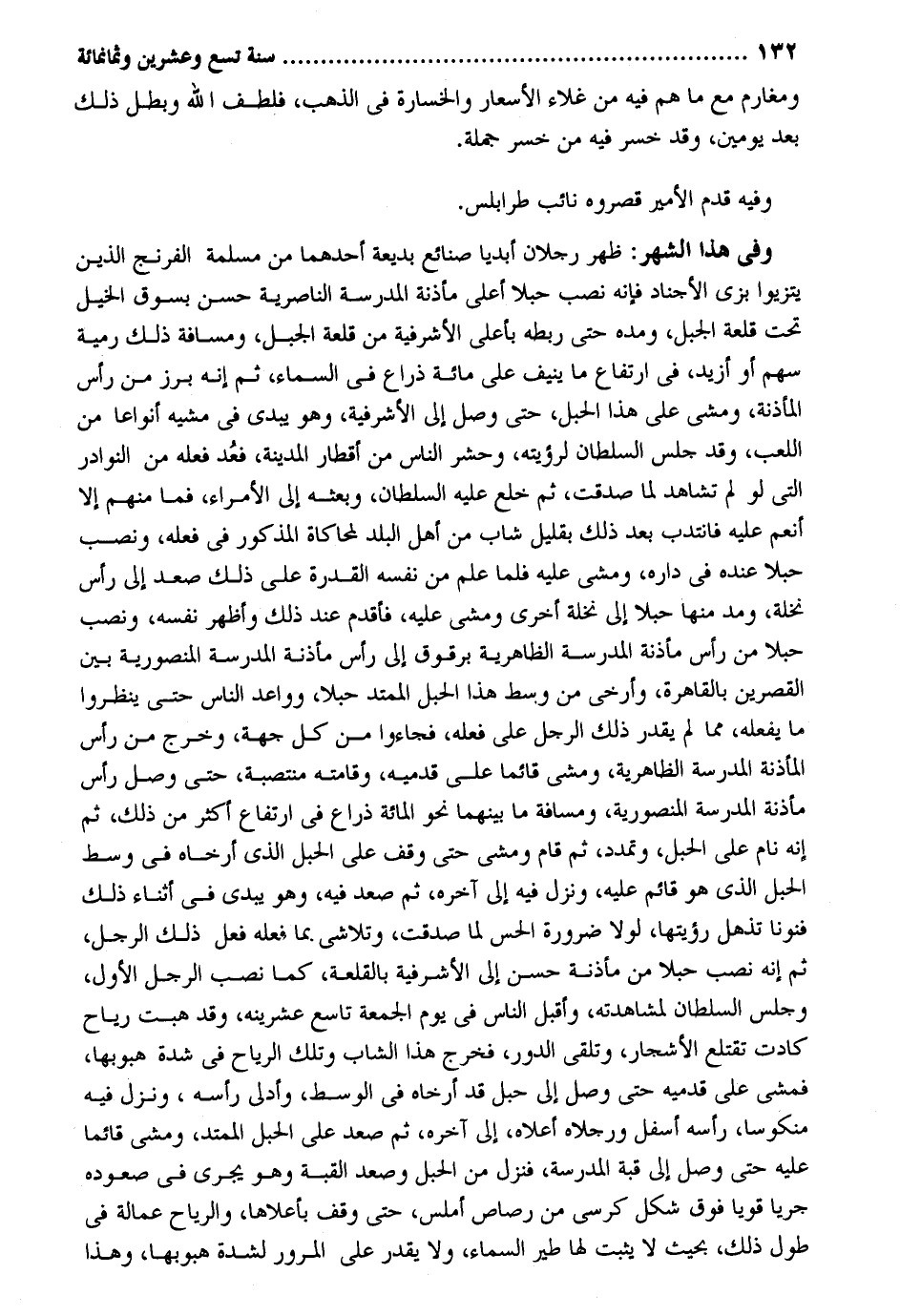 ومغارم مَعَ مَا هم فِيهِ من غلاء الأسعار والخسارة فِي الذَّهَب فلطف الله وَبَطل ذَلِك بعد يَوْمَيْنِ وَقد خسر فِيهِ من خسر جملَة. وَفِيه قدم الْأَمِير قصروه نَائِب طرابلس. وَفِي هَذَا الشَّهْر: ظهر رجلَانِ أبديا صنائع بديعة أَحدهمَا من مسلمة الفرنج الَّذين يتزيوا بزِي الأجناد فَإِنَّهُ نصب حبلاً أَعلَى مأذنة الْمدرسَة الناصرية حسن بسوق الْخَيل تَحت قلعة الْجَبَل ومده حَتَّى ربطه بِأَعْلَى الأشرفية من قلعة الْجَبَل ومسافة ذَلِك رمية سهم أَو أَزِيد فِي ارْتِفَاع مَا ينيف على مائَة ذِرَاع فِي السَّمَاء ثمَّ إِنَّه برز من رَأس المأذنة وَمَشى على هَذَا الْحَبل حَتَّى وصل إِلَى الأشرفية وَهُوَ يُبْدِي فِي مَشْيه أنواعاً من اللّعب وَقد جلس السُّلْطَان لرُؤْيَته وَحشر النَّاس من أقطار الْمَدِينَة فعد فعله من النَّوَادِر الَّتِي لَو لم تشاهد لما صدقت ثمَّ خلع عَلَيْهِ السُّلْطَان وَبَعثه إِلَى الْأُمَرَاء فَمَا مِنْهُم إِلَّا أنعم عَلَيْهِ فَانْتدبَ بعد ذَلِك بِقَلِيل شَاب من أهل الْبَلَد لمحاكاة الْمَذْكُور فِي فعله وَنصب حبلاً عِنْده فِي دَاره وَمَشى عَلَيْهِ فَلَمَّا علم من نَفسه الْقُدْرَة على ذَلِك صعد إِلَى رَأس نَخْلَة وَمد مِنْهَا حبلاً إِلَى نَخْلَة أُخْرَى وَمَشى عَلَيْهِ فأقدم عِنْد ذَلِك وَأظْهر نَفسه وَنصب حبلاً من رَأس مأذنة الْمدرسَة الظَّاهِرِيَّة برقوق إِلَى رَأس مأذنة الْمدرسَة المنصورية بَين القصرين بِالْقَاهِرَةِ وأرخي من وسط هَذَا الْحَبل الممتد حبلاً وواعد النَّاس حَتَّى ينْظرُوا مَا يَفْعَله مِمَّا لم يقدر ذَلِك الرجل على فعله فَجَاءُوا من كل جِهَة وَخرج من رَأس المأذنة الْمدرسَة الظَّاهِرِيَّة وَمَشى قَائِما على قَدَمَيْهِ وقامته منتصبة حَتَّى وصل رَأس مأذنة الْمدرسَة المنصورية ومسافة مَا بَينهمَا نَحْو الْمِائَة ذِرَاع فِي ارْتِفَاع أَكثر من ذَلِك ثمَّ إِنَّه نَام على الْحَبل وتمدد ثمَّ قَامَ وَمَشى حَتَّى وقف على الْحَبل الَّذِي أرخاه فِي وسط الْحَبل الَّذِي هُوَ قَائِم عَلَيْهِ وَنزل فِيهِ إِلَى آخِره ثمَّ صعد فِيهِ وَهُوَ يُبْدِي فِي أثْنَاء ذَلِك فنوناً تذهل رؤيتها لَوْلَا ضَرُورَة الْحس لما صدقت وتلاشى بِمَا فعله فعل ذَلِك الرجل ثمَّ إِنَّه نصب حبلاً من مأذنة حسن إِلَى الأشرفية بالقلعة كَمَا نصب الرجل الأول وَجلسَ السُّلْطَان لمشاهدته وَأَقْبل النَّاس فِي يَوْم الْجُمُعَة تَاسِع عشرينه وَقد هبت ريَاح كَادَت تقتلع الْأَشْجَار وتلقي الدّور فَخرج هَذَا الشَّاب وَتلك الرِّيَاح فِي شدَّة هبوبها فَمشى على قَدَمَيْهِ حَتَّى وصل إِلَى حَبل قد أرخاه فِي الْوسط وأدلى رَأسه وَنزل فِيهِ منكوساً رَأسه أَسْفَل وَرجلَاهُ أَعْلَاهُ إِلَى آخِره ثمَّ صعد على الْحَبل الممتد وَمَشى قَائِما عَلَيْهِ حَتَّى وصل إِلَى قبَّة الْمدرسَة فَنزل من الْحَبل وَصعد الْقبَّة وَهُوَ يجْرِي فِي صُعُوده جَريا قَوِيا فَوق شكل كرْسِي من رصاص أملس حَتَّى وقف بِأَعْلَاهَا والرياح عماله فِي طول ذَلِك بِحَيْثُ لَا يثبت لَهَا طير السَّمَاء وَلَا يقدر على الْمُرُور لشدَّة هبوبها وَهَذَا
