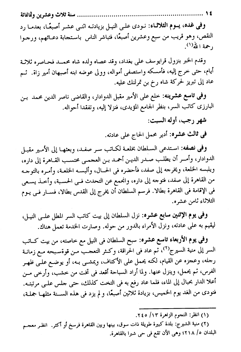 وَفِي غده يَوْم الثُّلَاثَاء: نُودي على النّيل بِزِيَادَتِهِ اثْنَي عشر إصبعا بَعْدَمَا رد النَّقْص وَهُوَ قريب من سبع وَعشْرين إصبعاً فتباشر النَّاس باستجابة دُعَائِهِمْ ورجوا رَحْمَة الله وَقدم الْخَبَر بنزول قرا يُوسُف على بَغْدَاد وَقد عَصَاهُ وَلَده شاه مُحَمَّد فحاصره ثَلَاثَة أَيَّام حَتَّى خرج إِلَيْهِ فأمسكه واستصفى أَمْوَاله وَولى عوضه ابْنه أَصْبَهَان أَمِير زاة ثمَّ عَاد إِلَى تبريز لحركة شاه رخ بن تمرلنك عَلَيْهِ. وَفِي تَاسِع عشرينه: خلع على الْأَمِير مقبل الدوادار وَالْقَاضِي نَاصِر الدّين مُحَمَّد بن الْبَارِزِيّ كَاتب السِّرّ بِنَظَر الْجَامِع المؤيدي فَنزلَا إِلَيْهِ وتفقدا أَحْوَاله. شهر رَجَب أَوله السبت: فِي ثَالِث عشره: أدير محمل الْحَاج على عَادَته وَفِي نصفه: استدعى السُّلْطَان بخلعة لكاتب سر صفد وبعثها إِلَى الْأَمِير مقبل الدوادار وَأمر أَن يطْلب صدر الدّين أَحْمد بن العجمي محتسب الْقَاهِرَة إِلَى دَاره ويلبسه الخلعة ويخرجه إِلَى صفد فَأحْضرهُ فِي الْحَال وَألبسهُ الخلعة وَأمره بالتوجه من الْقَاهِرَة إِلَى صفد فَتوجه إِلَى دَاره وانجمع عَن التحدث فِي الْحِسْبَة وَأخذ يسْعَى فِي الْإِقَامَة فِي الْقَاهِرَة بطالاً. فرسم السُّلْطَان أَن يخرج إِلَى الْقُدس بطالا فَسَار فِي يَوْم الثُّلَاثَاء ثامن عشره. وَفِي يَوْم الِاثْنَيْنِ سَابِع عشره: نزل السُّلْطَان إِلَى بَيت كَاتب السِّرّ المطل على النّيل ليقيم بِهِ على عَادَته وَنزل الْأُمَرَاء بالدور من حوله. وَصَارَت الْخدمَة تعْمل هُنَاكَ. وَفِي يَوْم الْأَرْبَعَاء تَاسِع عشره: سبح السُّلْطَان فِي النّيل مَعَ خاصته من بَيت كَاتب السِّرّ إِلَى منية السيرج ثمَّ عَاد فِي الحراقة وَكثر التَّعَجُّب من قُوَّة سبحه مَعَ زمانة رجله وعجزه عَن الْقيام لكنه يحمل على الأكتاف وَيَمْشي بِهِ أَو يوضع على ظهر الْفرس ثمَّ يحمل وَينزل عَنْهَا. وَلما أَرَادَ السباحة أقعد فِي تخت من خشب وأرخي من أعلا الدَّار بحبال إِلَى المَاء فَلَمَّا عَاد رفع بِهِ فِي التخت كَذَلِك حَتَّى جلس على مرتبته. فَنُوديَ من الْغَد يَوْم الْخَمِيس بِزِيَادَة ثَلَاثِينَ إصبعاً وَلم يزدْ فِي هَذِه السّنة مثلهَا جملَة