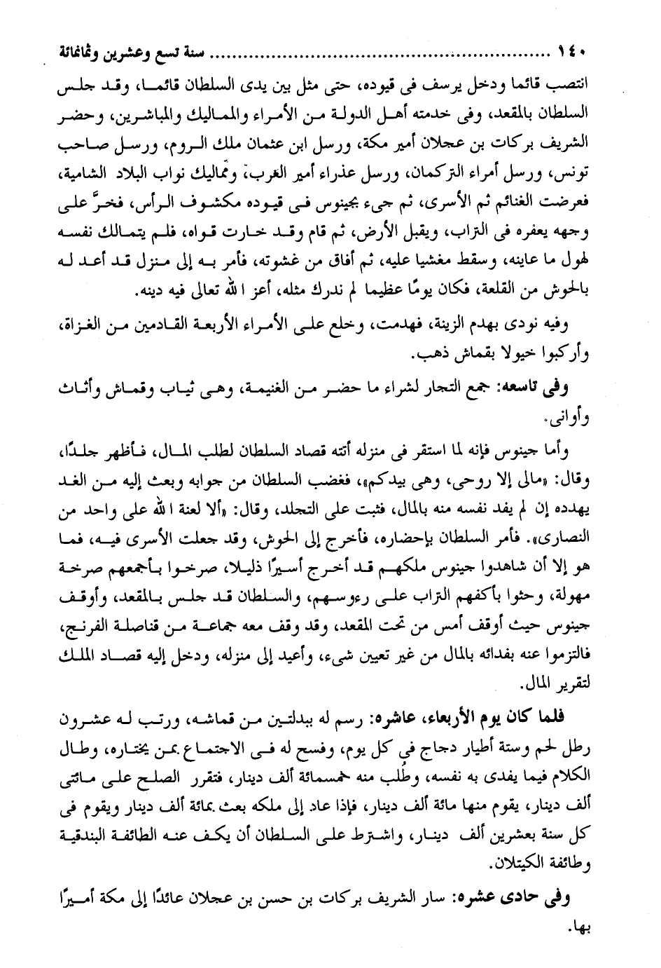انتصب قَائِما وَدخل يرسف فِي قيوده حَتَّى مثل بَين يَدي السُّلْطَان قَائِما وَقد جلس السُّلْطَان بالمقعد وَفِي خدمته أهل الدولة من الْأُمَرَاء والمماليك والمباشرين وَحضر الشريف بَرَكَات بن عجلَان أَمِير مَكَّة ورسل ابْن عُثْمَان ملك الرّوم ورسل صَاحب تونس ورسل أُمَرَاء التركمان ورسل عذراء أَمِير الغرب ومماليك نواب الْبِلَاد الشامية فعرضت الْغَنَائِم ثمَّ الأسرى ثمَّ جِيءَ بجينوس فِي قيوده مَكْشُوف الرَّأْس فَخر على وَجهه يعفره فِي التُّرَاب وَيقبل الأَرْض ثمَّ قَامَ وَقد خارت قواه فَلم يَتَمَالَك نَفسه لهول مَا عاينه وَسقط مغشياً عَلَيْهِ ثمَّ أَفَاق من غشوته فَأمر بِهِ إِلَى منزل قد أعد لَهُ بالحوش من القلعة فَكَانَ يَوْمًا عَظِيما لم ندرك مثله أعز الله تَعَالَى فِيهِ دينه. وَفِيه نُودي بهدم الزِّينَة فهدمت وخلع على الْأُمَرَاء الْأَرْبَعَة القادمين من الْغُزَاة وأركبوا خيولا بقماش ذهب. وَفِي تاسعه: جمع التُّجَّار لشراء مَا حضر من الْغَنِيمَة وَهِي ثِيَاب وقماش وأثاث وأواني. وَأما جينوس فَإِنَّهُ لما اسْتَقر فِي منزله أَتَتْهُ قصاد السُّلْطَان لطلب المَال فأظهر جلدا وَقَالَ: مَا لي إِلَّا روحي وَهِي بيدكم فَغَضب السُّلْطَان من جَوَابه وَبعث إِلَيْهِ من الْغَد يهدده أَن لم يفد نَفسه مِنْهُ بِالْمَالِ مُثبت على التجلد وَقَالَ: أَلا لعنة الله على وَاحِد من النَّصَارَى. فَأمر السُّلْطَان بإحضاره فَأخْرج إِلَى الحوش وَقد جعلت الأسرى فِيهِ فَمَا هُوَ إِلَّا أَن شاهدوا جينوس ملكهم قد أخرج أَسِيرًا ذليلاً صرخوا بأجمعهم صرخة مهولة وحثوا بأكفهم التُّرَاب على رُءُوسهم وَالسُّلْطَان قد جلس بالمقعد وأوقف جينوس حَيْثُ أوقف أمس من تَحت المقعد وَقد وقف مَعَه جمَاعَة من قناصلة الفرنج فالتزموا عَنهُ بفدائه بِالْمَالِ من غير تعْيين شَيْء وأعيد إِلَى منزله وَدخل إِلَيْهِ قصاد الْملك لتقرير المَال. فَلَمَّا كَانَ يَوْم الْأَرْبَعَاء عاشره: رسم لَهُ ببدلتين من قماشه ورتب لَهُ عشرُون رَطْل لحم وَسِتَّة أطيار دَجَاج فِي كل يَوْم وفسح لَهُ فِي الإجتماع بِمن يختاره وَطَالَ الْكَلَام فِيمَا يفْدي بِهِ نَفسه وَطلب مِنْهُ خَمْسمِائَة ألف دِينَار فتقرر الصُّلْح على مِائَتي ألف دِينَار يقوم مِنْهَا مائَة ألف دِينَار فَإِذا عَاد إِلَى ملكه بعث بِمِائَة ألف دِينَار وَيقوم فِي كل سنة بِعشْرين ألف دِينَار وَاشْترط على السُّلْطَان أَن يكف عَنهُ الطَّائِفَة البندقية وَطَائِفَة الكيتلان. وَفِي حادي عشره: سَار الشريف بَرَكَات بن حسن بن عجلَان عَائِدًا إِلَى مَكَّة أَمِيرا بهَا.