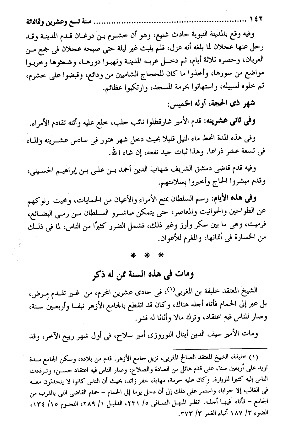 وَفِيه وَقع بِالْمَدِينَةِ النَّبَوِيَّة حَادث شنيع وَهُوَ أَن خشرم بن درغان قدم الْمَدِينَة وَقد رَحل عَنْهَا عجلَان لما بلغه أَنه عزل فَلم يلبث غير لَيْلَة حَتَّى صبحه عجلَان فِي جمع من العربان وحصره ثَلَاثَة أَيَّام ثمَّ دخل عربه الْمَدِينَة ونهبوا دورها وشعثوها وخربوا مَوَاضِع من سورها وَأخذُوا مَا كَانَ للحجاج الشاميين من ودائع وقبضوا على خشرم ثمَّ خلوه لسبيله واستهانوا بِحرْمَة الْمَسْجِد وارتكبوا عظائم. شهر ذِي الْحجَّة أَوله الْخَمِيس: وَفِي ثَانِي عشرينه: قدم الْأَمِير شارقطلوا نَائِب حلب خلع عَلَيْهِ وأتته تقادم الْأُمَرَاء. وَفِي هَذِه الْمدَّة انحط مَاء النّيل قَلِيلا بِحَيْثُ دخل شهر هتور فِي سادس عشرينه وَالْمَاء فِي تِسْعَة عشر ذِرَاعا. وَهَذَا ثبات جيد نَفعه إِن شَاءَ الله. وَفِيه قدم قَاضِي دمشق الشريف شهَاب الدّين أَحْمد بن عَليّ بن إِبْرَاهِيم الْحُسَيْنِي وَقدم مبشروا الْحَاج وأخبروا بسلامتهم. وَفِي هَذِه الْأَيَّام: رسم السُّلْطَان بِمَنْع الْأُمَرَاء والأعيان من الحمايات ومحيت رنوكهم عَن الطواحين والحوانيت والمعاصر حَتَّى يتَمَكَّن مباشرو السُّلْطَان من رمي البضائع فرميت وَهِي مَا بَين سكر وأرز وَغير ذَلِك فَشَمَلَ الضَّرَر كثيرا من النَّاس لما فِي ذَلِك من الخسارة فِي أثمانها والمغرم وَمَات فِي هَذِه السّنة مِمَّن لَهُ ذكر الشَّيْخ المعتقد خَليفَة بن المغربي فِي حادي عشْرين الْمحرم من غير تقدم مرض بل عبر إِلَى الْحمام فَأَتَاهُ أَجله هُنَاكَ وَكَانَ قد انْقَطع بالجامع الْأَزْهَر نيفاً وَأَرْبَعين سنة وَصَارَ للنَّاس فِيهِ اعْتِقَاد وَترك مَالا وأثاثاً لَهُ قدر. وَمَات الْأَمِير سيف الدّين أينال النوروزي أَمِير سلَاح فِي أول شهر ربيع الآخر قد