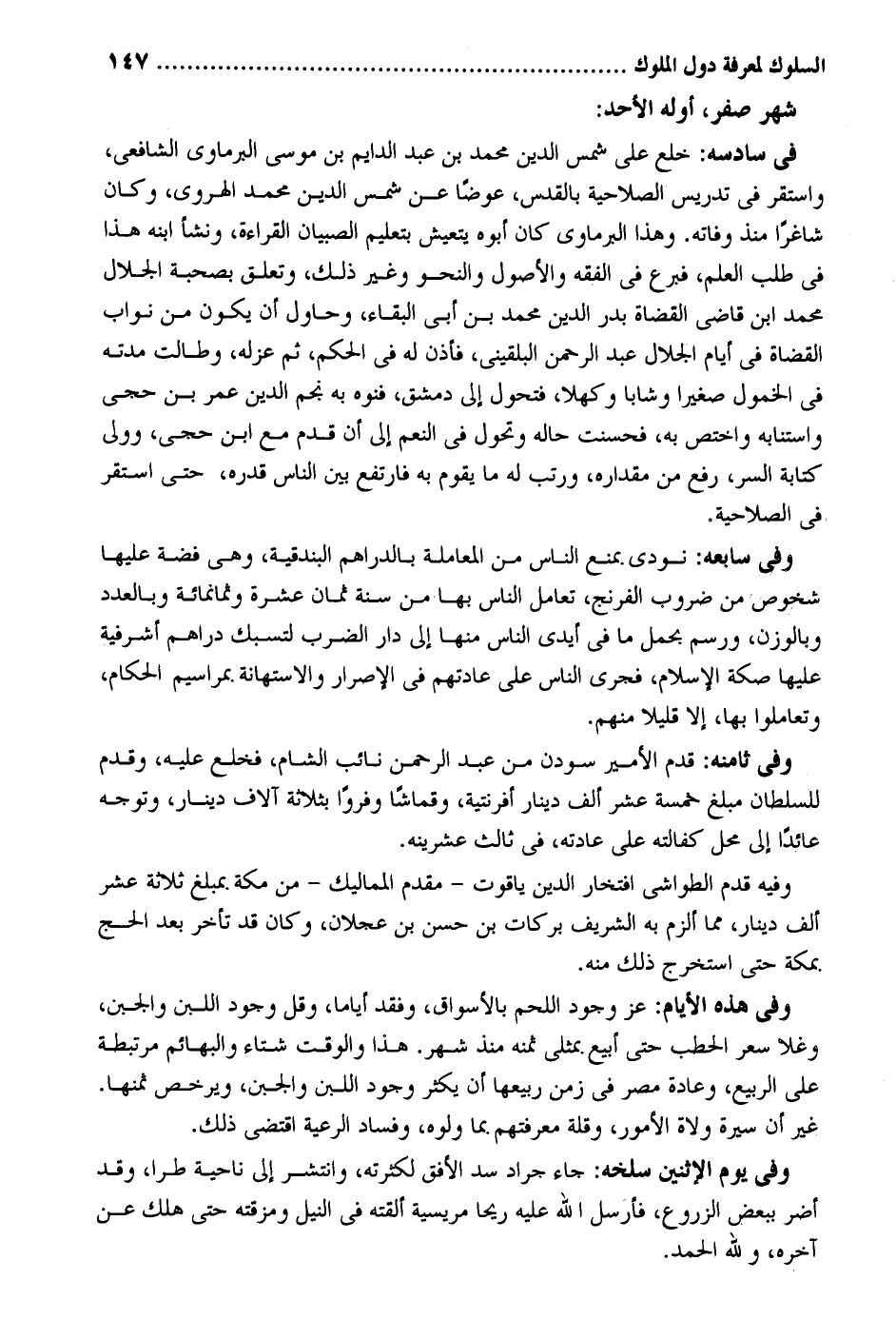 شهر صفر أَوله الْأَحَد: فِي سادسه: خلع على شمس الدّين مُحَمَّد بن عبد الدايم بن مُوسَى الْبرمَاوِيّ الشَّافِعِي وَاسْتقر فِي تدريس الصلاحية بالقدس عوضا عَن شمس الدّين مُحَمَّد الْهَرَوِيّ وَكَانَ شاغراً مُنْذُ وَفَاته. وَهَذَا الْبرمَاوِيّ كَانَ أَبوهُ يتعيش بتعليم الصّبيان الْقِرَاءَة وَنَشَأ ابْنه هَذَا فِي طلب الْعلم فبرع فِي الْفِقْه وَالْأُصُول والنحو وَغير ذَلِك وَتعلق بِصُحْبَة الْجلَال مُحَمَّد ابْن قَاضِي الْقُضَاة بدر الدّين مُحَمَّد بن أبي الْبَقَاء وحاول أَن يكون من نواب الْقُضَاة فِي أَيَّام الْجلَال عبد الرَّحْمَن البُلْقِينِيّ فَأذن لَهُ فِي الحكم ثمَّ عَزله وطالت مدَّته فِي الخمول صَغِيرا وشاباً وكهلا فتحول إِلَى دمشق فَنَوَّهَ بِهِ نجم الدّين عمر بن حجي واستنابه واختص بِهِ فحسنت حَاله وتحول فِي النعم إِلَى أَن قدم مَعَ ابْن حجي وَولي كِتَابَة السِّرّ رفع من مِقْدَاره ورتب لَهُ مَا يقوم بِهِ فارتفع بَين النَّاس قدره حَتَّى اسْتَقر فِي الصلاحية. وَفِي سابعه: نُودي بِمَنْع النَّاس من الْمُعَامَلَة بِالدَّرَاهِمِ البندقية وَهِي فضَّة عَلَيْهَا شخوص من ضروب الفرنج تعامل النَّاس بهَا من سنة ثَمَان عشرَة وَثَمَانمِائَة وبالعدد وبالوزن ورسم بِحمْل مَا فِي أَيدي النَّاس مِنْهَا إِلَى دَار الضَّرْب لتسبك دَرَاهِم أشرفية عَلَيْهَا صَكَّة الْإِسْلَام فَجرى النَّاس على عَادَتهم فِي الْإِصْرَار والاستهانة بمراسيم الْحُكَّام وتعاملوا بهَا إِلَّا قَلِيلا مِنْهُم. وَفِي ثامنه: قدم الْأَمِير سودن من عبد الرَّحْمَن نَائِب الشَّام فَخلع عَلَيْهِ وَقدم للسُّلْطَان مبلغ خَمْسَة عشر ألف دِينَار أفرنتية وقماشاً وفرواً بِثَلَاثَة آلَاف دِينَار وَتوجه عَائِدًا إِلَى مَحل كفَالَته على عَادَته فِي ثَالِث عشرينه. وَفِيه قدم الطواشي افتخار الدّين ياقوت - مقدم المماليك - من مَكَّة بمبلغ ثَلَاثَة عشر ألف دِينَار مِمَّا ألزم بِهِ الشريف بَرَكَات بن حسن بن عجلَان وَكَانَ قد تَأَخّر بعد الْحَج بِمَكَّة حَتَّى وَفِي هَذِه الْأَيَّام: عز وجود اللَّحْم بالأسواق وفقد أَيَّامًا وَقل وجود اللَّبن والجبن وغلا سعر الْحَطب حَتَّى أبيع بمثلي ثمنه مُنْذُ شهر. هَذَا وَالْوَقْت شتاء والبهائم مرتبطة على الرّبيع وَعَادَة مصر فِي زمن ربيعها أَن يكثر وجود اللَّبن والجبن ويرخص ثمنهَا. غير أَن سيرة وُلَاة الْأُمُور وَقلة معرفتهم بِمَا ولوه وَفَسَاد الرّعية اقْتضى ذَلِك. وَفِي يَوْم الِاثْنَيْنِ سلخه: جَاءَ جَراد سد الْأُفق لكثرته وانتشر إِلَى نَاحيَة طرا وَقد أضرّ بِبَعْض الزروع فَأرْسل الله عَلَيْهِ ريحًا مريسية ألقته فِي النّيل ومزقته حَتَّى هلك عَن آخِره وَللَّه الْحَمد.