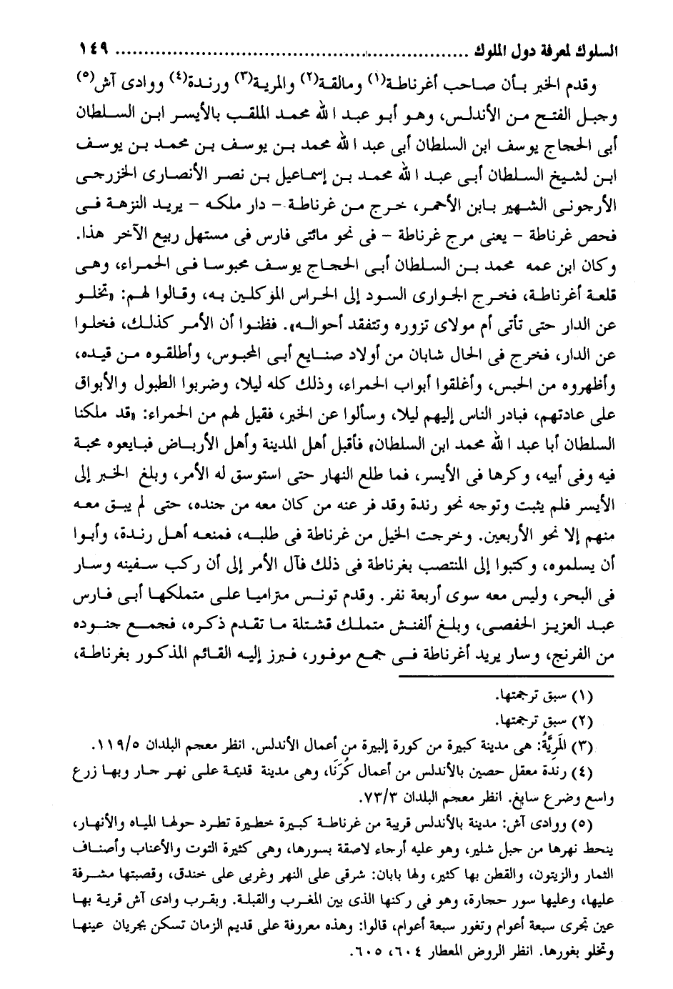وَقدم الْخَبَر بِأَن صَاحب أغرناطة ومالقة والمرية ورندة ووادي آش وجبل الْفَتْح من الأندلس وَهُوَ أَبُو عبد الله مُحَمَّد الملقب بالأيسر ابْن السُّلْطَان أبي الْحجَّاج يُوسُف ابْن السُّلْطَان أبي عبد الله مُحَمَّد بن يُوسُف بن مُحَمَّد بن يُوسُف ابْن لشيخ السُّلْطَان أبي عبد الله مُحَمَّد بن إِسْمَاعِيل بن نصر الْأنْصَارِيّ الخزرجي الأرجوني الشهير بِابْن الْأَحْمَر خرج من غرناطة - دَار ملكه - يُرِيد النزهة فِي فحص غرناطة - يَعْنِي مرج غرناطة - فِي نَحْو مِائَتي فَارس فِي مستهل ربيع الآخر هَذَا وَكَانَ ابْن عَمه مُحَمَّد بن السُّلْطَان أبي الْحجَّاج يُوسُف مَحْبُوسًا فِي الْحَمْرَاء وَهِي قلعة أغرناطة فَخرج الْجَوَارِي السود إِلَى الحراس الموكلين بِهِ وَقَالُوا لَهُم: تَخْلُو عَن الدَّار حَتَّى تَأتي أم مولَايَ تزوره وتتفقد أَحْوَاله. فظنوا أَن الْأَمر كَذَلِك فَخلوا عَن الدَّار فَخرج فِي الْحَال شابان من أَوْلَاد صنايع أبي الْمَحْبُوس وأطلقوه من قَيده وأظهروه من الْحَبْس وَأَغْلقُوا أَبْوَاب الْحَمْرَاء وَذَلِكَ كُله لَيْلًا وضربوا الطبول والأبواق على عَادَتهم فبادر النَّاس إِلَيْهِم لَيْلًا وسألوا عَن الْخَبَر فَقيل لَهُم من الْحَمْرَاء: قد ملكنا السُّلْطَان أَبَا عبد الله مُحَمَّد ابْن السُّلْطَان فَأقبل أهل الْمَدِينَة وَأهل الأرباض فَبَايعُوهُ محبَّة فِيهِ وَفِي أَبِيه وَكرها فِي الْأَيْسَر فَمَا طلع النَّهَار حَتَّى استوسق لَهُ الْأَمر وَبلغ الْخَبَر إِلَى الْأَيْسَر فَلم يثبت وَتوجه نَحْو رندة وَقد فر عَنهُ من كَانَ مَعَه من جنده حَتَّى لم يبْق مَعَه مِنْهُم إِلَّا نَحْو الْأَرْبَعين. وَخرجت الْخَيل من غرناطة فِي طلبه فَمَنعه أهل رندة وأبوا أَن يسلموه وَكَتَبُوا إِلَى المنتصب بغرناطة فِي ذَلِك فآل الْأَمر إِلَى أَن ركب سَفِينِهِ وَسَار فِي الْبَحْر وَلَيْسَ مَعَه سوى أَرْبَعَة نفر. وَقدم تونس مترامياً على متملكها أبي فَارس عبد الْعَزِيز الحفصي وَبلغ ألفنش متملك قشتلة مَا تقدم ذكره فَجمع جُنُوده من الفرنج وَسَار يُرِيد أغرناطة فِي جع موفور فبرز إِلَيْهِ الْقَائِم الْمَذْكُور بغرناطة