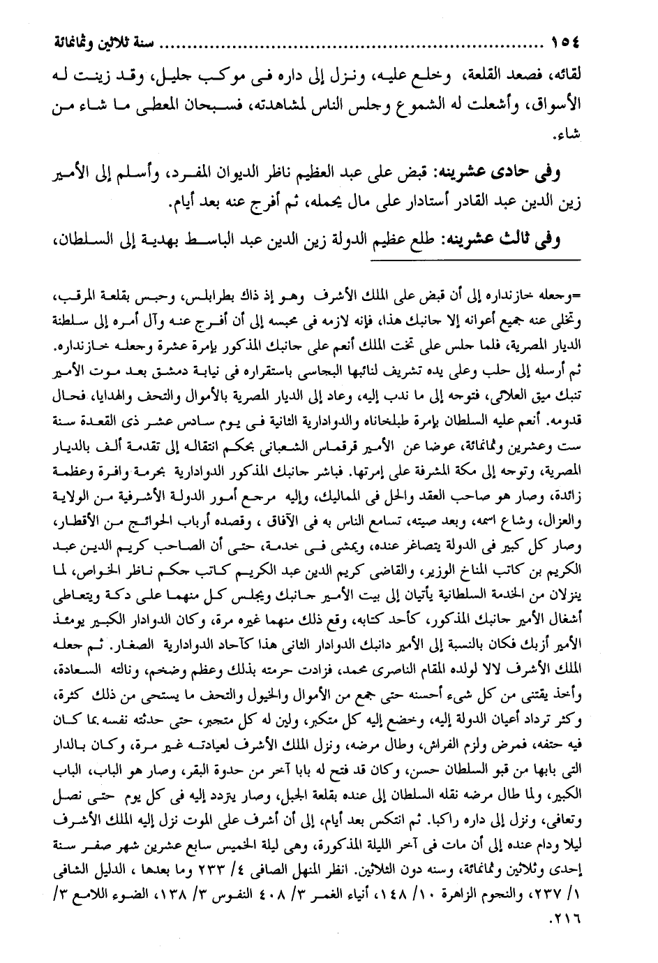 لِقَائِه فَصَعدَ القلعة وخلع عَلَيْهِ وَنزل إِلَى دَاره فِي موكب جليل وَقد زينت لَهُ الْأَسْوَاق وأشعلت لَهُ الشموع وَجلسَ النَّاس لمشاهدته فسبحان الْمُعْطِي مَا شَاءَ من شَاءَ. وَفِي حادي عشرينه: قبض على عبد الْعَظِيم نَاظر الدِّيوَان الْمُفْرد وَأسلم إِلَى الْأَمِير زين الدّين عبد الْقَادِر أستادار على مَال يحملهُ ثمَّ أفرج عَنهُ بعد أَيَّام. وَفِي ثَالِث عشرينه: طلع عَظِيم الدولة زين الدّين عبد الباسط بهدية إِلَى السُّلْطَان