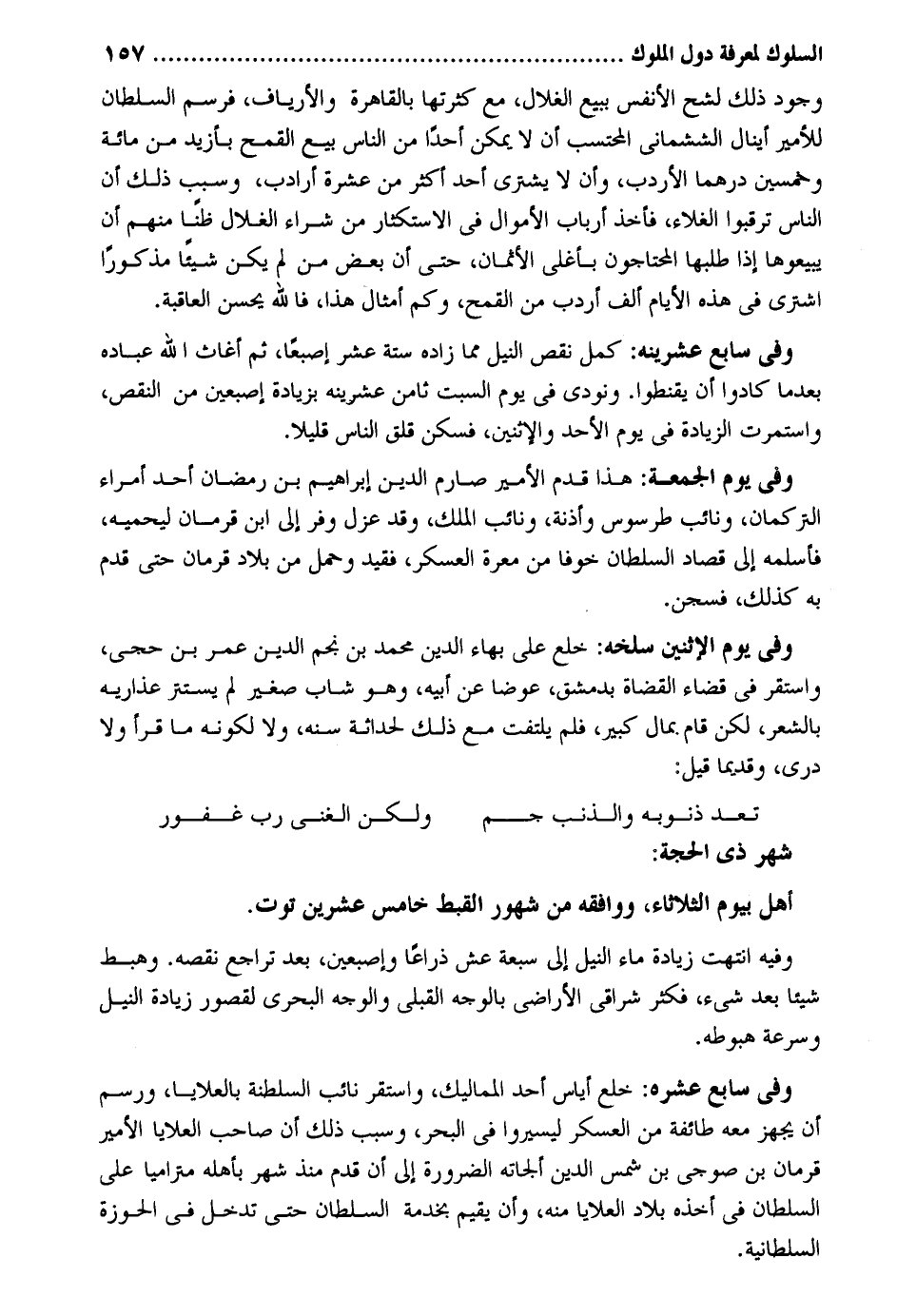 وجود ذَلِك لشح الْأَنْفس بِبيع الغلال مَعَ كثرتها بِالْقَاهِرَةِ والأرياف فرسم السُّلْطَان للأمير أينال الششماني الْمُحْتَسب أَن لَا يُمكن أحدا من النَّاس بيع الْقَمْح بأزيد من مائَة وَخمسين درهما الأردب وَأَن لَا يَشْتَرِي أحد أَكثر من عشرَة أرادب وَسبب ذَلِك أَن النَّاس ترقبوا الغلاء فَأخذ أَرْبَاب الْأَمْوَال فِي الاستكثار من شِرَاء الغلال ظنا مِنْهُم أَن يبيعوها إِذا طلبَهَا المحتاجون بأغلى الْأَثْمَان حَتَّى أَن بعض من لم يكن شَيْئا مَذْكُور اشْترى فِي هَذِه الْأَيَّام ألف أردب من الْقَمْح وَكم أَمْثَال هَذَا فَالله يحسن الْعَاقِبَة. وَفِي سَابِع عشرينه: كمل نقص النّيل مِمَّا زَاده سِتَّة عشر إصبعاً ثمَّ أغاث الله عباداً بعد مَا كَادُوا أَن يقنطوا. وَنُودِيَ فِي يَوْم السبت ثامن عشرينه بِزِيَادَة إِصْبَعَيْنِ من النَّقْص. واستمرت الزِّيَادَة فِي يَوْم الْأَحَد والاثنين فسكن قلق النَّاس قَلِيلا. وَفِي يَوْم الْجُمُعَة: هَذَا قدم الْأَمِير صارم الدّين إِبْرَاهِيم بن رَمَضَان أحد أُمَرَاء: التركمان ونائب طرسوس وأذنة ونائب الْملك وَقد عزل وفر إِلَى ابْن قرمان ليحميه فأسلمه إِلَى قصاد السُّلْطَان خوفًا من معرة الْعَسْكَر فقيد وَحمل من بِلَاد قرمان حَتَّى قدم بِهِ كَذَلِك فسجن. وَفِي يَوْم الِاثْنَيْنِ سلخه: خلع على بهاء الدّين مُحَمَّد بن نجم الدّين عمر بن حجي. وَاسْتقر فِي قَضَاء الْقُضَاة بِدِمَشْق عوضا عَن أَبِيه وَهُوَ شَاب صَغِير لم يسْتَتر عذاريه بالشعر لَكِن قَامَ بِمَال كَبِير فَلم يلْتَفت مَعَ ذَلِك لحداثة سنه وَلَا لكَونه مَا قَرَأَ وَلَا درى وقديماً قيل: تعد ذنُوبه والذنب جم وَلَكِن الْغَنِيّ رب غَفُور شهر ذِي الْحجَّة. أهل بِيَوْم الثُّلَاثَاء وَوَافَقَهُ من شهور القبط خَامِس عشْرين توت. وَفِيه انْتَهَت زِيَادَة مَاء النّيل إِلَى سَبْعَة عشر ذِرَاعا وإصبعين بعد تراجع نَقصه. وَهَبَطَ شَيْئا بعد شَيْء فَكثر شراقي الْأَرَاضِي بِالْوَجْهِ القبلي وَالْوَجْه البحري لقُصُور زِيَادَة النّيل وَسُرْعَة هُبُوطه. وَفِي سَابِع عشره: خلع أياس أحد المماليك وَاسْتقر نَائِب السلطة بالعلايا ورسم أَن يُجهز مَعَه طَائِفَة من الْعَسْكَر ليسيروا فِي الْبَحْر وَسبب ذَلِك أَن صَاحب العلايا الْأَمِير قرمان بن صوجي بن شمس الدّين ألجأته الضَّرُورَة إِلَى أَن قدم مُنْذُ شهر بأَهْله مترامياً على السُّلْطَان فِي أَخذه بِلَاد العلايا مِنْهُ وَأَن يُقيم بِخِدْمَة السُّلْطَان حَتَّى تدخل فِي الْحَوْزَة السُّلْطَانِيَّة.