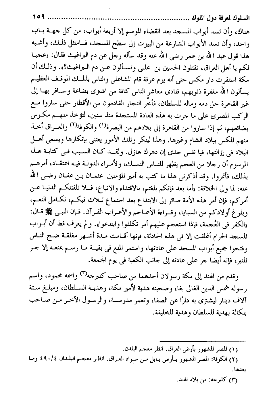 هُنَاكَ وَأَن تسد أَبْوَاب الْمَسْجِد بعد انْقِضَاء الْمَوْسِم إِلَّا أَرْبَعَة أَبْوَاب من كل جِهَة بَاب وَاحِد وَأَن تسد الْأَبْوَاب الشارعة من الْبيُوت إِلَى سطح الْمَسْجِد فامتثل ذَلِك وأشبه هَذَا قَول عبد الله بن عمر رَضِي الله عَنهُ وَقد سَأَلَهُ رجل عَن دم البراغيث فَقَالَ: عجبا لكم يَا أهل الْعرَاق تقتلون الْحُسَيْن بن عَليّ وتسألون عَن دم البراغيث. وَذَلِكَ أَن مَكَّة اسْتَقَرَّتْ دَار مكس حَتَّى أَنه يَوْم عَرَفَة قَامَ المشاعلي وَالنَّاس بذلك الْموقف الْعَظِيم يسْأَلُون الله مغْفرَة ذنوبهم فَنَادَى معاشر النَّاس كَافَّة من اشْترى بضَاعَة وسافر بهَا إِلَى غير الْقَاهِرَة حل دَمه وَمَاله للسُّلْطَان فَأخر التُّجَّار القادمون من الأقطار حَتَّى سَارُوا مَعَ الركب الْمصْرِيّ على مَا جرت بِهِ هَذِه الْعَادة المستجدة مُنْذُ سِنِين لتؤخذ مِنْهُم مكوس بضائعهم ثمَّ إِذا سَارُوا من الْقَاهِرَة إِلَى بِلَادهمْ من الْبَصْرَة والكوفة وَالْعراق أَخذ مِنْهُم المكس بِبِلَاد الشَّام وَغَيرهَا. وَهَذَا لينكر وَتلك الْأُمُور يعتني بإنكارها وَيسْعَى أهل الْبِلَاد فِي إِزَالَتهَا فيا نفس جدي إِن دهرك هازل. وَلَقَد كَانَ السَّبَب فِي كِتَابَة هَذَا المرسوم أَن رجلا من الْعَجم يظْهر للنَّاس النّسك ولأمراء الدولة فِيهِ اعْتِقَاد أَمرهم بذلك فأتمروا. وَقد أذكرني هَذَا مَا كتب بِهِ أَمِير الْمُؤمنِينَ عُثْمَان بن عَفَّان رَضِي الله عَنهُ لما ولي الْخلَافَة: أما بعد فَإِنَّكُم بَلغْتُمْ بالإقتداء والإتباع فَلَا تلفتنكم الدُّنْيَا عَن أَمركُم فَإِن أَمر هَذِه الْأمة صائر إِلَى الابتداع بعد اجْتِمَاع ثَلَاث فِيكُم تَكَامل النعم وبلوغ أَوْلَادكُم من السبايا وَقِرَاءَة الْأَعَاجِم والأعراب الْقُرْآن. فَإِن النَّبِي صلى الله عَلَيْهِ وَسلم قَالَ: الْكفْر فِي العجمة فَإِذا استعجم عَلَيْهِم أَمر تكلفوا وابتدعوا. وَلم يعرف قطّ أَن أَبْوَاب الْمَسْجِد الْحَرَام أغلقت إِلَّا فِي هَذِه الْحَادِثَة فَإِنَّهَا أَقَامَت مُدَّة أشهر مغلقة ضج النَّاس وفتحوا جَمِيع أَبْوَاب الْمَسْجِد على عَادَتهَا وَاسْتمرّ الْمَنْع فِي بَقِيَّة مَا رسم وَقدم من الْهِنْد إِلَى مَكَّة رسولان أَحدهمَا من صَاحب كلبرجه واسْمه مَحْمُود وَاسم رَسُوله شمس الدّين الغالي بغا وصحبته هَدِيَّة لأمير مَكَّة وهدية السُّلْطَان ومبلغ سِتَّة آلَاف دِينَار ليَشْتَرِي بِهِ دَارا عَن الصَّفَا وتعمر مدرسة وَالرَّسُول الآخر من صَاحب بنكالة بهدية للسُّلْطَان وهدية للخليفة.