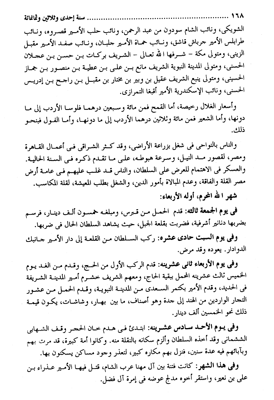 الشويكي ونائب الشَّام سودن من عبد الرَّحْمَن ونائب حلب الْأَمِير قصروه ونائب طرابلس الْأَمِير جرباش قاشق ونائب حماة الْأَمِير جلبان ونائب صفد الْأَمِير مقبل الزيني ومتولي مَكَّة - شرفها الله تَعَالَى - الشريف بَرَكَات بن حسن بن عجلَان الحسني ومتولي الْمَدِينَة النَّبَوِيَّة الشريف مَانع بن عَليّ بن عَطِيَّة بن مَنْصُور بن جماز الْحُسَيْنِي ومتولي يَنْبع الشريف عقيل بن وبير بن مُخْتَار بن مقبل بن رَاجِح بن إِدْرِيس الحسني ونائب الْإسْكَنْدَريَّة الْأَمِير أقبغا التمرازي. وأسعار الغلال رخيصة أما الْقَمْح فَمن مائَة وَسبعين درهما فُلُوسًا الأردب إِلَى مَا دونهَا وَأما الشّعير فَمن مائَة وَثَلَاثِينَ درهما الأردب إِلَى مَا دونهَا وَأما الفول فبنحو ذَلِك. وَالنَّاس بالنواحي فِي شغل بزراعة الْأَرَاضِي وَقد كثر الشراقي فِي أَعمال الْقَاهِرَة ومصر لقُصُور مد النّيل وَسُرْعَة هُبُوطه على مَا تقدم ذكره فِي السّنة الحالية. والعسكر فِي الاهتمام للعرض على السُّلْطَان وَالنَّاس قد غلب عَلَيْهِم فِي عَامَّة أَرض مصر الْقلَّة والفاقة وَعدم المبالاة بِأُمُور الدّين والشغل بِطَلَب الْمَعيشَة لقلَّة المكاسب. شهر الله الْمحرم أَوله الْأَرْبَعَاء: فِي يَوْم الْجُمُعَة ثالثه: قدم الْحمل من قبرس ومبلغه خَمْسُونَ ألف فِي ينار فرسم بضربها دَنَانِير وَفِي يَوْم السبت حادي عشره: ركب السُّلْطَان من القلعة إِلَى دَار الْأَمِير جَانِبك الدوادار. يعودهُ وَقد مرض. وَفِي يَوْم الْأَرْبَعَاء ثَالِث عشرينه: قدم الركب الأول من الْحَج وَقدم من الْغَد يَوْم الْخَمِيس ثَالِث عشرينه الْمحمل بِبَقِيَّة الْحَاج وَمَعَهُمْ الشريف خشرم أَمِير الْمَدِينَة الشَّرِيفَة فِي الْحَدِيد وَقدم الْأَمِير بكتمر السَّعْدِيّ من الْمَدِينَة النَّبَوِيَّة وَقدم الْحمل من عشور التُّجَّار الواردين من الْهِنْد إِلَى جدة وَهُوَ أَصْنَاف مَا بَين بهار وشاشات يكون قيمَة ذَلِك نَحْو الْخمسين ألف دِينَار. وَفِي يَوْم الْأَحَد سادس عشرينه: ابتدئ فِي هدم خَان الْحجر وقف الشهابي الششماني وَقد أَخذه السُّلْطَان وألزم سكانه بالنقلة مِنْهُ. وَكَانُوا أمة كَبِيرَة قد مرت بهم وبآبائهم فِيهِ عدَّة سِنِين فَنزل بهم مكاره كَبِير لتعذر وجود مسَاكِن يسكنون بهَا. وَفِي هَذَا الشَّهْر: كَانَت فتْنَة بَين آل مهنا عرب الشَّام قتل فِيهَا الْأَمِير عذراء بن عَليّ بن نعير وَاسْتقر أَخُوهُ مُدْلِج عوضه فِي إمرة آل فضل.