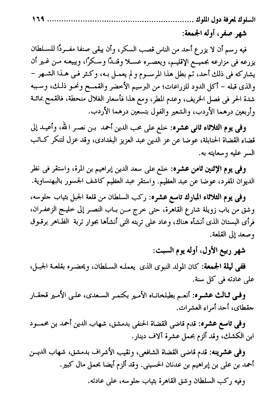 شهر صفر أَوله الْجُمُعَة: فِيهِ رسم أَن لَا يزرع أحد من النَّاس قصب السكر وَأَن يبْقى صنفا مُفردا للسُّلْطَان يزرعه فِي مزارعه بِجَمِيعِ الإقليم ويعصره عسلاً وقنداً وسكراً ويبيعه من غير أَن يُشَارِكهُ فِي ذَلِك أحد ثمَّ بَطل هَذَا المرسوم وَلم يعْمل بِهِ وَكثر فِي هَذَا الشَّهْر - وَالَّذِي قبله - أكل الدُّود للزراعات من البرسيم الْأَخْضَر والقمح وَنَحْو ذَلِك وَسَببه شدَّة الْحر فِي فصل الخريف وَعدم الْمَطَر وَمَعَ هَذَا فأسعار الغلال منحطة فالقمح بِمِائَة وَأَرْبَعين درهما الأردب وَالشعِير والفول بتسعين درهما الأردب. وَفِي يَوْم الثُّلَاثَاء ثَانِي عشره: خلع على محب الدّين أَحْمد بن نصر الله وأعيد إِلَى قَضَاء الْقُضَاة الْحَنَابِلَة عوضا عَن عز الدّين عبد الْعَزِيز الْبَغْدَادِيّ وَقد عزل لتنكر كَاتب السِّرّ عَلَيْهِ وسعايته بِهِ. وَفِي يَوْم الِاثْنَيْنِ ثامن عشره. خلع على سعد الدّين إِبْرَاهِيم بن الْمرة وَاسْتقر فِي نظر الدِّيوَان الْمُفْرد عوضا عَن عبد الْعَظِيم. وَاسْتقر عبد الْعَظِيم كاشف الجسور بالبهنساوية. وَفِي يَوْم الثُّلَاثَاء الْمُبَارك تَاسِع عشره: ركب السُّلْطَان من قلعة الْجَبَل بِثِيَاب جُلُوسه وشق من بَاب زويلة شَارِع الْقَاهِرَة حَتَّى خرج من بَاب النَّصْر إِلَى خليج الزَّعْفَرَان فَرَأى الْبُسْتَان الَّذِي أنشأه هُنَاكَ وَعَاد على تربته الَّتِي أَنْشَأَهَا بجوار تربة الظَّاهِر برقوق وَصعد إِلَى القلعة. شهر ربيع الأول أَوله يَوْم السبت: فَفِي لَيْلَة الْجُمُعَة: كَانَ المولد النَّبَوِيّ الَّذِي يعمله السُّلْطَان ويحضره بقلعة الْجَبَل على عَادَته فِي وَفِي ثَالِث عشره: أنعم بطبلخاناه الْأَمِير بكتمر السَّعْدِيّ على الْأَمِير قجقار جقطاي أحد أُمَرَاء العشرات. وَفِي تَاسِع عشره: قدم قَاضِي الْقُضَاة الْحَنَفِيّ بِدِمَشْق شهَاب الدّين أَحْمد بن مَحْمُود ابْن الكشك وَقد ألزم بِحمْل عشرَة آلَاف دِينَار. وَفِي عشرينه: قدم قَاضِي الْقُضَاة الشَّافِعِي ونقيب الْأَشْرَاف بِدِمَشْق شهَاب الدّين أَحْمد بن عَليّ بن إِبْرَاهِيم بن عدنان الْحُسَيْنِي. وَقد ألزم أَيْضا بِحمْل مَال كَبِير. وَفِيه ركب السُّلْطَان وشق الْقَاهِرَة بِثِيَاب جُلُوسه على عَادَته.