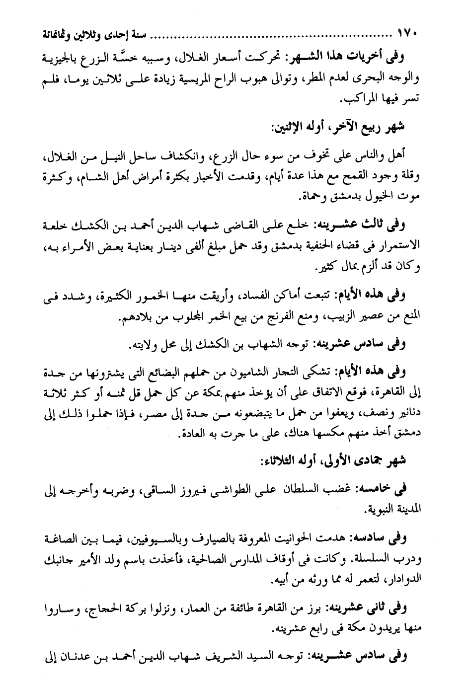 وَفِي أخريات هَذَا الشَّهْر: تحركت أسعار الغلال وَسَببه خسة الزَّرْع بالجيزية وَالْوَجْه البحري لعدم الْمَطَر وتوالى هبوب الرِّيَاح المريسية زِيَادَة على ثَلَاثِينَ يَوْمًا فَلم تسر فِيهَا المراكب. شهر ربيع الآخر أَوله الِاثْنَيْنِ: أهل وَالنَّاس على تخوف من سوء حَال الزَّرْع وانكشاف سَاحل النّيل من الغلال وَقلة وجود الْقَمْح مَعَ هَذَا عدَّة أَيَّام وقدمت الْأَخْبَار بِكَثْرَة أمراض أهل الشَّام وَكَثْرَة موت الْخُيُول بِدِمَشْق وحماة. وَفِي ثَالِث عشرينه: خلع على القَاضِي شهَاب الدّين أَحْمد بن الكشك خلعة الِاسْتِمْرَار فِي قَضَاء وَفِي هَذِه الْأَيَّام: تتبعت أَمَاكِن الْفساد وأريقت مِنْهَا الْخُمُور الْكَثِيرَة وشدد فِي الْمَنْع من عصير الزَّبِيب وَمنع الفرنج من بيع الْخمر المجلوب من بِلَادهمْ. وَفِي سادس عشرينه: توجه الشهَاب بن الكشك إِلَى مَحل ولَايَته. وَفِي هَذِه الْأَيَّام: تشكى التُّجَّار الشاميون من حملهمْ البضائع الَّتِي يشترونها من جدة إِلَى الْقَاهِرَة فَوَقع الِاتِّفَاق على أَن يُؤْخَذ مِنْهُم بِمَكَّة عَن كل حمل قل ثمنه أَو كثر ثَلَاثَة دَنَانِير وَنصف ويعفوا من حمل مَا يتبضعونه من جدة إِلَى مصر فَإِذا حملُوا ذَلِك إِلَى دمشق أَخذ مِنْهُم مكسها هُنَاكَ على مَا جرت بِهِ الْعَادة. شهر جُمَادَى الأولى أَوله الثُّلَاثَاء: فِي خامسه: غضب السُّلْطَان على الطواشي فَيْرُوز الساقي وضربه وَأخرجه إِلَى الْمَدِينَة النَّبَوِيَّة. وَفِي سادسه: هدمت الحوانيت الْمَعْرُوفَة بالصيارف وبالسيوفيين فِيمَا بَين الصاغة ودرب السلسلة. وَكَانَت فِي أوقاف الْمدَارِس الصالحية فَأخذت باسم ولد الْأَمِير جَانِبك الدوادار لتعمر لَهُ مِمَّا وَرثهُ من أَبِيه. وَفِي ثَانِي عشرينه: برز من الْقَاهِرَة طَائِفَة من الْعمار ونزلوا بركَة الْحجَّاج وَسَارُوا مِنْهَا يُرِيدُونَ وَفِي سادس عشرينه: توجه السَّيِّد الشريف شهَاب الدّين أَحْمد بن عدنان إِلَى