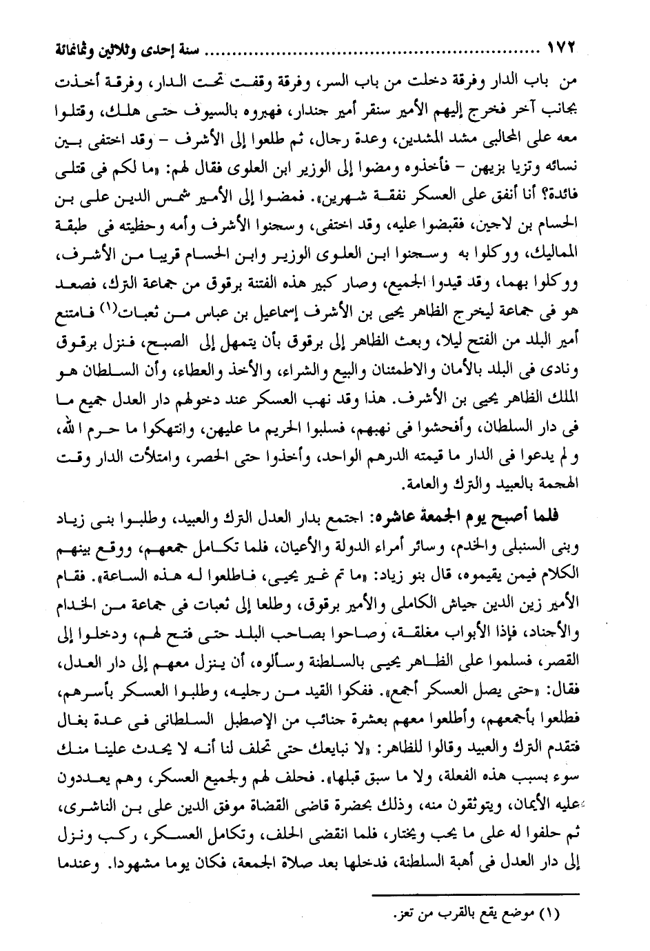 من بَاب الدَّار وَفرْقَة دخلت من بَاب السِّرّ وَفرْقَة وقفت تَحت الدَّار وَفرْقَة أخذت بِجَانِب آخر فَخرج إِلَيْهِم الْأَمِير سنقر أَمِير جندار فهبروه بِالسُّيُوفِ حَتَّى هلك وَقتلُوا مَعَه عَليّ المحالبي مشد المشدين وعدة رجال ثمَّ طلعوا إِلَى الْأَشْرَف - وَقد اختفى بَين نِسَائِهِ وتزيا بزيهن - فَأَخَذُوهُ ومضوا إِلَى الْوَزير ابْن الْعلوِي فَقَالَ لَهُم: مَا لكم فِي قَتْلَى فَائِدَة أَنا أنْفق على الْعَسْكَر نَفَقَة شَهْرَيْن فَمَضَوْا إِلَى الْأَمِير شمس الدّين عَليّ بن الحسام بن لاجين فقبضوا عَلَيْهِ وَقد اختفى وسجنوا الْأَشْرَف وَأمه وحظيته فِي طبقَة المماليك ووكلوا بِهِ وسجنوا ابْن الْعلوِي الْوَزير وَابْن الحسام قَرِيبا من الْأَشْرَف ووكلوا بهما وَقد قيدوا الْجَمِيع وَصَارَ كَبِير هَذِه الْفِتْنَة برقوق من جمَاعَة التّرْك فَصَعدَ هُوَ فِي جمَاعَة ليخرج الظَّاهِر يحيى بن الْأَشْرَف إِسْمَاعِيل بن عَبَّاس من ثعبات فَامْتنعَ أَمِير الْبَلَد من الْفَتْح لَيْلًا وَبعث الظَّاهِر إِلَى برقوق بِأَن يتمهل إِلَى الصُّبْح فَنزل برقوق ونادى فِي الْبَلَد بالأمان والاطمئنان وَالْبيع وَالشِّرَاء وَالْأَخْذ وَالعطَاء وَأَن السُّلْطَان هُوَ الْملك الظَّاهِر يحيى بن الْأَشْرَف. هَذَا وَقد نهب الْعَسْكَر عِنْد دُخُولهمْ دَار الْعدْل جَمِيع مَا فِي دَار السُّلْطَان وأفحشوا فِي نهبهم فسلبوا الْحَرِيم مَا عَلَيْهِنَّ وانتهكوا مَا حرم الله وَلم يدعوا فِي الدَّار مَا قِيمَته الدِّرْهَم الْوَاحِد وَأخذُوا حَتَّى الْحصْر وامتلأت الدَّار وَقت الهجمة بالعبيد وَالتّرْك والعامة. فَلَمَّا أصبح يَوْم الْجُمُعَة عاشره: اجْتمع بدار الْعدْل التّرْك وَالْعَبِيد وطلبوا بني زِيَاد وَبني السنبلي والخدم وَسَائِر أُمَرَاء الدولة والأعيان فَلَمَّا تَكَامل جمعهم وَوَقع بَينهم الْكَلَام فِيمَن يقيموه قَالَ بَنو زِيَاد: مَا تمّ غير يحيى فَاطَّلَعُوا لَهُ هَذِه السَّاعَة. فَقَامَ الْأَمِير زين الدّين جياش الكاملي والأمير برقوق وطلعا إِلَى ثعبات فِي جمَاعَة من الخدام والأجناد فَإِذا الْأَبْوَاب مغلقة وصاحوا بِصَاحِب الْبَلَد حَتَّى فتح لَهُم ودخلوا إِلَى الْقصر فَسَلمُوا على الظَّاهِر يحيى بالسلطنة وسألوه أَن ينزل مَعَهم إِلَى دَار الْعدْل فَقَالَ: حَتَّى يصل الْعَسْكَر أجمع. ففكوا الْقَيْد من رجلَيْهِ وطلبوا الْعَسْكَر بأسرهم فطلعوا بأجمعهم وأطلعوا مَعَهم بِعشْرَة جنائب من الاصطبل السلطاني فِي عدَّة بغال فَتقدم التّرْك وَالْعَبِيد وَقَالُوا للظَّاهِر: لَا نُبَايِعك حَتَّى تحلف لنا أَنه لَا يحدث علينا مِنْك سوء بِسَبَب هَذِه الفعلة وَلَا مَا سبق قبلهَا. فَحلف لَهُم وَلِجَمِيعِ الْعَسْكَر وهم يعددون عَلَيْهِ الْأَيْمَان ويتوثقون مِنْهُ وَذَلِكَ بِحَضْرَة قَاضِي الْقُضَاة موفق الدّين عَليّ بن النَّاشِرِيّ ثمَّ حلفوا لَهُ على مَا يحب ويختار فَلَمَّا انْقَضى الْحلف وتكامل الْعَسْكَر ركب وَنزل إِلَى دَار الْعدْل فِي أهبة السلطنة فَدَخلَهَا بعد صَلَاة الْجُمُعَة فَكَانَ يَوْمًا مشهوداً. وعندما