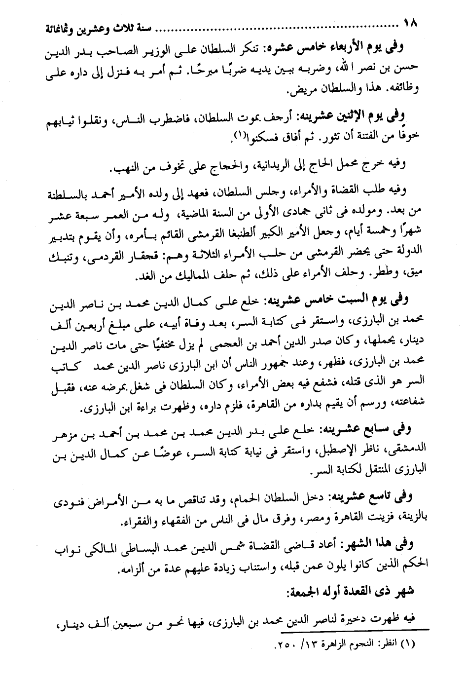 وَفِي يَوْم الْأَرْبَعَاء خَامِس عشره: تنكر السُّلْطَان على الْوَزير الصاحب بدر الدّين حسن بن نصر الله وضربه ببين يَدَيْهِ ضربا مبرحاً. ثمَّ أَمر بِهِ فَنزل إِلَى دَاره على وظائفه. هَذَا وَالسُّلْطَان مَرِيض. وَفِي يَوْم الِاثْنَيْنِ عشرينه: أرجف بِمَوْت السُّلْطَان فاضطرب النَّاس ونقلوا ثِيَابهمْ خوفًا من الْفِتْنَة أَن تثور ثمَّ أَفَاق فسكنوا. وَفِيه خرج محمل الْحَاج إِلَى الريدانية وَالْحجاج على تخوف من النهب. وَفِيه طلب الْقُضَاة والأمراء وَجلسَ السُّلْطَان فعهد إِلَى وَلَده الْأَمِير أَحْمد بالسلطة من بعد. ومولده فِي ثَانِي جُمَادَى الأولى من السّنة الْمَاضِيَة وَله من الْعُمر سَبْعَة عشر شهرا وَخَمْسَة أَيَّام وَجعل الْأَمِير الْكَبِير ألطنبغا القرمشي الْقَائِم بأَمْره وَأَن يقوم بتدبير الدولة حَتَّى يحضر القرمشي من حلب الْأُمَرَاء الثَّلَاثَة وهم: قجقار القردمي وتنبك ميق وططر. وَحلف الْأُمَرَاء على ذَلِك وَفِي يَوْم السبت خَامِس عشرينه: خلع على كَمَال الدّين مُحَمَّد بن نَاصِر الدّين مُحَمَّد بن الْبَارِزِيّ وَاسْتقر فِي كِتَابَة السِّرّ بعد وَفَاة أَبِيه على مبلغ أَرْبَعِينَ ألف دِينَار يحملهَا وَكَانَ صدر الدّين أَحْمد بن العجمي لم يزل مختفياً حَتَّى مَاتَ نَاصِر الدّين مُحَمَّد بن الْبَارِزِيّ فَظهر وَعند جُمْهُور النَّاس أَن ابْن الْبَارِزِيّ نَاصِر الدّين مُحَمَّد كَاتب السِّرّ هُوَ الَّذِي قَتله فشفع فِيهِ بعض الْأُمَرَاء وَكَانَ السُّلْطَان فِي شغل بمرضه عَنهُ فَقبل شَفَاعَته ورسم أَن يُقيم بداره من الْقَاهِرَة فَلَزِمَ دَاره وَظَهَرت بَرَاءَة ابْن الْبَارِزِيّ. وَفِي سَابِع عشرينه: خلع على بدر الدّين مُحَمَّد بن مُحَمَّد بن أَحْمد بن مزهر الدِّمَشْقِي نَاظر الإصطبل وَاسْتقر فِي نِيَابَة كِتَابَة السِّرّ عوضا عَن كَمَال الدّين بن الْبَارِزِيّ الْمُنْتَقل لكتابة السِّرّ. وَفِي تَاسِع عشرينه: دخل السُّلْطَان الْحمام وَقد تناقص مَا بِهِ من الْأَمْرَاض فَنُوديَ بالزينة فزينت الْقَاهِرَة ومصر وَفرق مَال فِي النَّاس من الْفُقَهَاء والفقراء. وَفِي هَذَا الشَّهْر: أعَاد قَاضِي الْقُضَاة شمس الدّين مُحَمَّد الْبِسَاطِيّ الْمَالِكِي نواب الحكم الَّذين كَانُوا يلون عَمَّن قبله واستناب زِيَادَة عَلَيْهِم عدَّة من إِلْزَامه. شهر ذِي الْقعدَة أَوله الْجُمُعَة: فِيهِ ظَهرت دخيرة لناصر الدّين مُحَمَّد بن الْبَارِزِيّ فِيهَا نَحْو من سبعين ألف دِينَار