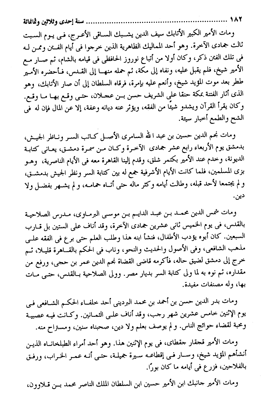 وَمَات الْأَمِير الْكَبِير الأتابك سيف الدّين يشبك الساقي الْأَعْرَج فِي يَوْم السبت ثَالِث جُمَادَى الْآخِرَة. وَهُوَ أحد المماليك الظَّاهِرِيَّة الَّذين خَرجُوا فِي أَيَّام الْفِتَن وَمِمَّنْ لَهُ فِي تِلْكَ الْفِتَن ذكر وَكَانَ أَولا من أَتبَاع نوروز الحافظي فِي قِيَامه بِالشَّام ثمَّ صَار مَعَ الْأَمِير شيخ فَلم يقبل عَلَيْهِ ونفاه إِلَى مَكَّة ثمَّ حمله مِنْهَا إِلَى الْقُدس فَأحْضرهُ الْأَمِير ططر بعد موت الْمُؤَيد شيخ وانعم عَلَيْهِ بإمرة فرقاه السُّلْطَان إِلَى أَن صَار الأتابك وَهُوَ الَّذِي أثار الْفِتْنَة بِمَكَّة حنقا على الشريف حسن بن عجلَان حَتَّى وَقع بهَا مَا وَقع. وَكَانَ يقْرَأ الْقُرْآن ويشدو شَيْئا من الْفِقْه ويؤثر عَنهُ ديانه وعفة إِلَّا عَن المَال فَإِن لَهُ فِي الشُّح والطمع أَخْبَار سَيِّئَة. وَمَات نجم الدّين حُسَيْن بن عبد الله السامري الأَصْل كَاتب السِّرّ وناظر الْجَيْش بِدِمَشْق يَوْم الْأَرْبَعَاء رَابِع عشر جُمَادَى الْآخِرَة وَكَانَ من سَمُرَة دمشق يعاني كِتَابَة الديونة وخدم عِنْد الْأَمِير بكتمر شلق وَقدم إِلَيْنَا الْقَاهِرَة مَعَه فِي الْأَيَّام الناصرية وَهُوَ بزِي الْمُسلمين فَلَمَّا كَانَت الْأَيَّام الأشرفية جمع لَهُ بَين كِتَابَة السِّرّ وَنظر الْجَيْش بِدِمَشْق وَلم يجتمعا لأحد قبله وطالت أَيَّامه وَكثر مَاله حَتَّى أَتَاهُ حمامه وَلم يشهر بِفضل وَلَا دين. وَمَات شمس الدّين مُحَمَّد بن عبد الدايم بن مُوسَى الْبرمَاوِيّ مدرس الصلاحية بالقدس فِي يَوْم الْخَمِيس ثَانِي عشْرين جُمَادَى الْآخِرَة وَقد أناف على السِّتين بل قَارب السّبْعين. كَانَ أَبوهُ يُؤَدب الْأَطْفَال فَنَشَأَ ابْنه هَذَا وَطلب الْعلم حَتَّى برع فِي الْفِقْه على مَذْهَب الشَّافِعِي وَفِي الْأُصُول والْحَدِيث والنحو وناب فِي الحكم بِالْقَاهِرَةِ قَلِيلا ثمَّ خرج إِلَى دمشق لضيق حَاله فَأكْرمه قَاضِي الْقُضَاة نجم الدّين عمر بن حجي وَرفع من مِقْدَاره ثمَّ نوه بِهِ لما ولي كِتَابَة السِّرّ بديار مصر. وَولي الصلاحية بالقدس حَتَّى مَاتَ بهَا وَله مصنفات مفيدة. وَمَات بدر الدّين حسن بن أَحْمد بن مُحَمَّد البرديني أحد خلفاء الحكم الشَّافِعِي فِي يَوْم الِاثْنَيْنِ خَامِس عشْرين شهر رَجَب وَقد أناف على الثَّمَانِينَ. وَكَانَت فِيهِ عصبية ومحبة لقَضَاء حوائج النَّاس. وَلم يُوصف بِعلم وَلَا دين صحبناه سِنِين ومستراح مِنْهُ. وَمَات الْأَمِير قجقار جقطاي فِي يَوْم الِاثْنَيْنِ هَذَا. وَهُوَ أحد أُمَرَاء الطبلخاناه الَّذين أنشأهم الْمُؤَيد شيخ وَسَار فِي إقطاعه سيرة جميلَة حَتَّى أَنه عمر الخراب ورفق بالفلاحين فزرع فِي أَيَّامه مَا كَانَ بوراً. وَمَات الْأَمِير جَانِبك ابْن الْأَمِير حُسَيْن ابْن السُّلْطَان الْملك النَّاصِر مُحَمَّد بن قلاوون