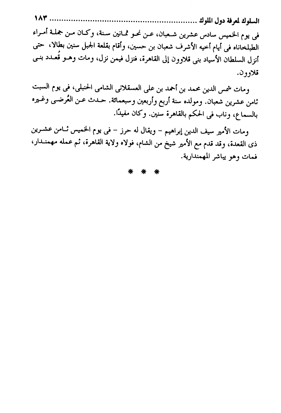 فِي يَوْم الْخَمِيس سادس عشْرين شعْبَان عَن نَحْو ثَمَانِينَ سنة وَكَانَ من جملَة أُمَرَاء. الطبلخاناه فِي أَيَّام أَخِيه الْأَشْرَف شعْبَان بن حُسَيْن وَأقَام بقلعة الْجَبَل سِنِين بطالا حتر أنزل السُّلْطَان الأسياد بني قلاوون إِلَى الْقَاهِرَة فَنزل فِيمَن نزل وَمَات وَهُوَ قعدد بني قلاوون. وَمَات شمس الدّين مُحَمَّد بن أَحْمد بن عَليّ الْعَسْقَلَانِي الشَّامي الْحَنْبَلِيّ فِي يَوْم السبت ثامن عشْرين شعْبَان. ومولده سنة أَربع وَأَرْبَعين وَسَبْعمائة. حدث عَن العرضي وَغَيره بِالسَّمَاعِ وناب فِي الحكم بِالْقَاهِرَةِ سِنِين. وَكَانَ مُفِيدا. وَمَات الْأَمِير سيف الدّين إِبْرَاهِيم - وَيُقَال لَهُ حرز - فِي يَوْم الْخَمِيس ثامن عشْرين ذِي الْقعدَة وَقد قدم مَعَ الْأَمِير شيخ من الشَّام فولاه ولَايَة الْقَاهِرَة ثمَّ عمله مهمندار فَمَاتَ وَهُوَ يُبَاشر المهمندارية