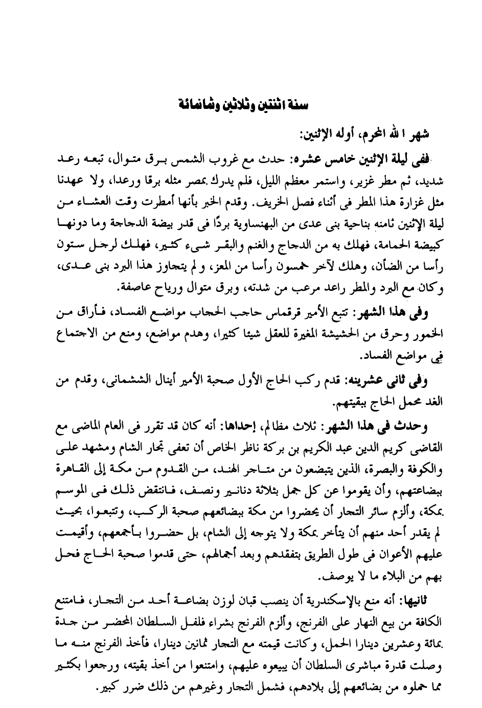 شهر الله الْمحرم أَوله الِاثْنَيْنِ: فَفِي لَيْلَة الِاثْنَيْنِ خَامِس عشره: حدث مَعَ غرُوب الشَّمْس برق متوال تبعه رعد شَدِيد ثمَّ مطر غزير وَاسْتمرّ مُعظم اللَّيْل فَلم يدْرك بِمصْر مثله برقاً ورعداً وَلَا عهدنا مثل غزارة هَذَا الْمَطَر فِي أثْنَاء فصل الخريف. وَقدم الْخَبَر بِأَنَّهَا أمْطرت وَقت الْعشَاء من لَيْلَة الِاثْنَيْنِ ثامنه بِنَاحِيَة بني عدي من البهنساوية بردا فِي قدر بَيْضَة الدَّجَاجَة وَمَا دونهَا كبيضة الْحَمَامَة فَهَلَك بِهِ من الدَّجَاج وَالْغنم وَالْبَقر شَيْء كثير فَهَلَك لرجل سِتُّونَ رَأْسا من الضَّأْن وَهلك لآخر خَمْسُونَ رَأْسا من الْمعز وَلم يتَجَاوَز هَذَا الْبرد بني عدي وَكَانَ مَعَ الْبرد والمطر راعد مرعب من شدته وبرق متوال ورياح عَاصِفَة. وَفِي هَذَا الشَّهْر: تتبع الْأَمِير قرقماس حَاجِب الْحجاب مَوَاضِع الْفساد فأراق من الْخُمُور وَحرق من الحشيشة الْمُغيرَة لِلْعَقْلِ شَيْئا كثيرا وَهدم مَوَاضِع وَمنع من الِاجْتِمَاع فِي مَوَاضِع الْفساد. وَفِي ثَانِي عشرينه: قدم ركب الْحَاج الأول صُحْبَة الْأَمِير أينال الششماني وَقدم من الْغَد محمل الْحَاج ببقيتهم. وَحدث فِي هَذَا الشَّهْر: ثَلَاث مظالم إِحْدَاهَا: أَنه كَانَ قد تقرر فِي الْعَام الْمَاضِي مَعَ الفاضي كريم الدّين عبد الْكَرِيم بن بركَة نَاظر الْخَاص أَن تعفي تجار الشَّام ومشهد عَليّ والكوفة وَالْبَصْرَة الَّذين يتبضعون من متاجر الْهِنْد من الْقدوم من مَكَّة إِلَى الْقَاهِرَة بضاعتهم وَأَن يقومُوا عَن كل جمل بِثَلَاثَة دَنَانِير وَنصف فَانْتقضَ ذَلِك فِي الْمَوْسِم بِمَكَّة وألزم سَائِر التُّجَّار أَن يحضروا من مَكَّة ببضائعهم صُحْبَة الركب وتتبعوا بِحَيْثُ لم يقدر أحد مِنْهُم أَن يتَأَخَّر بِمَكَّة وَلَا يتَوَجَّه إِلَى الشَّام بل حَضَرُوا بأجمعهم وأقيمت عَلَيْهِم الأعوان فِي طول الطَّرِيق بتفقدهم وَبعد أجمالهم حَتَّى قدمُوا صُحْبَة الْحَاج فَحل بهم من الْبلَاء مَا لَا يُوصف. ثَانِيهَا: أَنه منع بالإسكندرية أَن ينصب قبان لوزن بضَاعَة أحد من التُّجَّار فَامْتنعَ الكافة من بيع النَّهَار على الفرنج وألزم الفرنج بشرَاء فلفل السُّلْطَان الْمحْضر من جدة بِمِائَة وَعشْرين دِينَارا الْحمل وَكَانَت قِيمَته مَعَ التُّجَّار ثَمَانِينَ دِينَارا فَأخذ الفرنج مِنْهُ مَا وصلت قدرَة مباشري السُّلْطَان أَن يبيعوه عَلَيْهِم وامتنعوا من أَخذ بَقِيَّته وَرَجَعُوا بِكَثِير مِمَّا حملوه من بضائعهم إِلَى بِلَادهمْ فَشَمَلَ التُّجَّار وَغَيرهم من ذَلِك ضَرَر كَبِير.