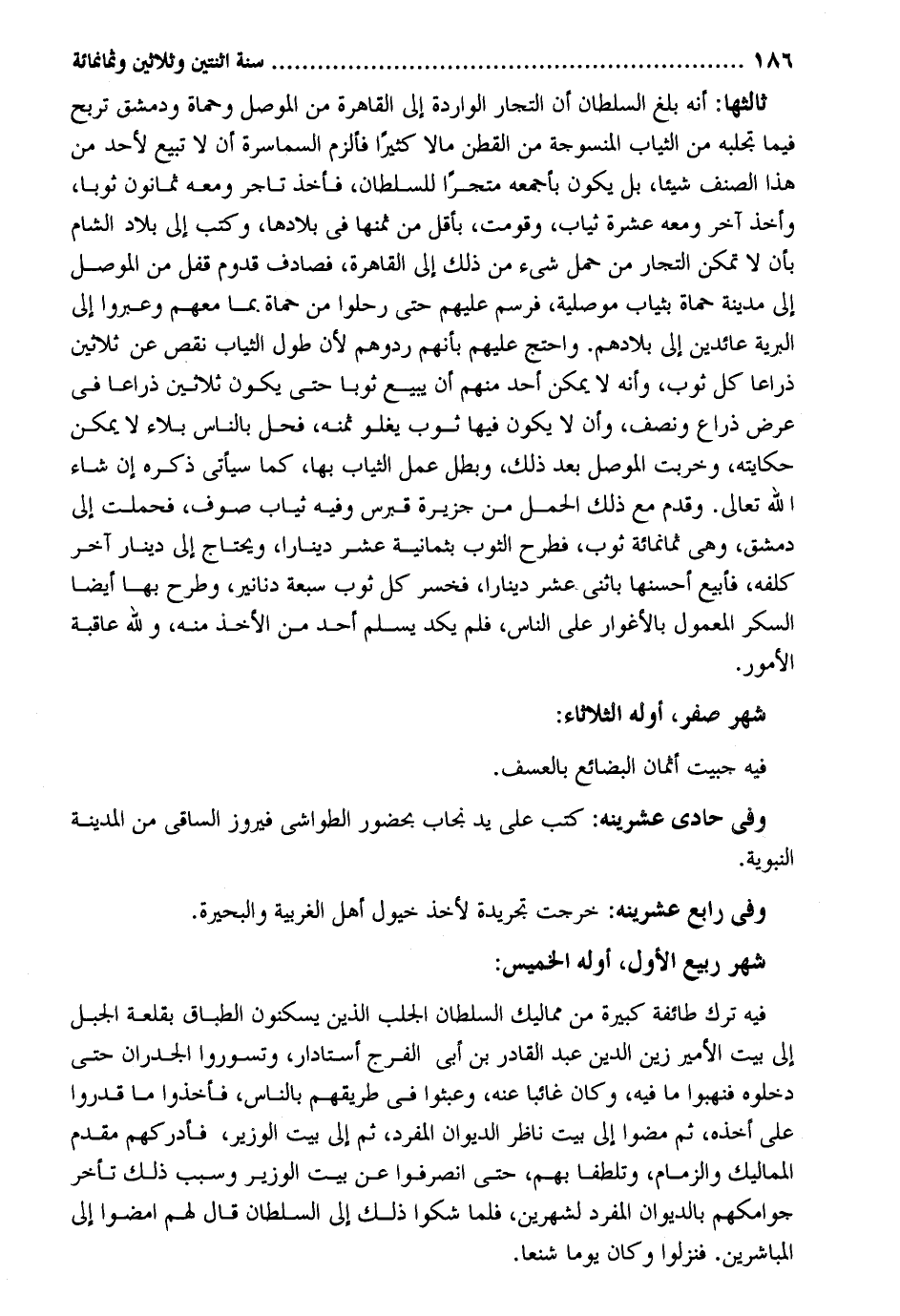 ثَالِثهَا: أَنه بلغ السُّلْطَان أَن التُّجَّار الْوَارِدَة إِلَى الْقَاهِرَة من الْموصل وحماة ودمشق تربح فِيمَا تجلبه من الثِّيَاب المنسوجة من الْقطن مَالا كثيرا فألزم السماسره أَن لَا تبيع لأحد من هَذَا الصِّنْف شَيْئا بل يكون بأجمعه متجراً للسُّلْطَان فَأخذ تَاجر وَمَعَهُ ثَمَانُون ثوبا وَأخذ آخر وَمَعَهُ عشرَة ثِيَاب وقومت بِأَقَلّ من ثمنهَا فِي بلادها وَكتب إِلَى بِلَاد الشَّام بِأَن لَا تمكن التُّجَّار من حمل شَيْء من ذَلِك إِلَى الْقَاهِرَة فصادف قدوم قفل من الْموصل إِلَى مَدِينَة حماة بِثِيَاب موصلية فرسم عَلَيْهِم حَتَّى رحلوا من حماة. مِمَّا مَعَهم وعبروا إِلَى الْبَريَّة عائدين إِلَى بِلَادهمْ. وَاحْتج عَلَيْهِم بِأَنَّهُم ردوهم لِأَن طول الثِّيَاب نقص عَن ثَلَاثِينَ ذِرَاعا كل ثوب وَأَنه لَا يُمكن أحد مِنْهُم أَن يَبِيع ثوبا حَتَّى يكون ثَلَاثِينَ ذِرَاعا فِي عرض ذِرَاع وَنصف وَأَن لَا يكون فِيهَا ثوب يغلو ثمنه فَحل بِالنَّاسِ بلَاء لَا يُمكن حكايته وَخَربَتْ الْموصل بعد ذَلِك وَبَطل عمل الثِّيَاب بهَا كَمَا سَيَأْتِي ذكره إِن شَاءَ الله تَعَالَى. وَقدم مَعَ ذَلِك الْحمل من جَزِيرَة قبرس وَفِيه ثِيَاب صوف فَحملت إِلَى دمشق وَهِي ثَمَانمِائَة ثوب مطرح الثَّوْب بِثمَانِيَة عشر دِينَارا وَيحْتَاج إِلَى دِينَار آخر كلفه فأبيع أحْسنهَا بِاثْنَيْ عشر دِينَارا فخسر كل ثوب سَبْعَة دَنَانِير وَطرح بهَا أَيْضا السكر الْمَعْمُول بالأغوار على النَّاس فَلم يكد يسلم أحد من الْأَخْذ مِنْهُ وَللَّه عَاقِبَة الْأُمُور. شهر صفر أَوله الثُّلَاثَاء: فِيهِ جبيت أَثمَان البضائع بالعسف. وَفِي حادي عشرينه: كتب على يَد نجاب بِحُضُور الطواشي فَيْرُوز الساقي من الْمَدِينَة النَّبَوِيَّة. شهر ربيع الأول أَوله الْخَمِيس: فِيهِ ترك طَائِفَة كَبِيرَة من مماليك السُّلْطَان الجلب الَّذين يسكنون الطباق بقلعة الْجَبَل إِلَى بَيت الْأَمِير زين الدّين عبد الْقَادِر بن أبي الْفرج أستادار وتسوروا الجدران حَتَّى دَخَلُوهُ فنهبوا مَا فِيهِ وَكَانَ غَائِبا عَنهُ وعبثوا فِي طريقهم بِالنَّاسِ فَأخذُوا مَا قدرُوا على أَخذه ثمَّ مضوا إِلَى بَيت نَاظر الدِّيوَان الْمُفْرد ثمَّ إِلَى بَيت الْوَزير فأدركهم مقدم المماليك والزمام وتلطفا بهم حَتَّى انصرفوا عَن بَيت الْوَزير وَسبب ذَلِك تَأَخّر جوامكهم بالديوان الْمُفْرد لشهرين فَلَمَّا شكوا ذَلِك إِلَى السُّلْطَان قَالَ لَهُم امضوا إِلَى المباشرين. فنزلوا وَكَانَ يَوْمًا شنعاً.