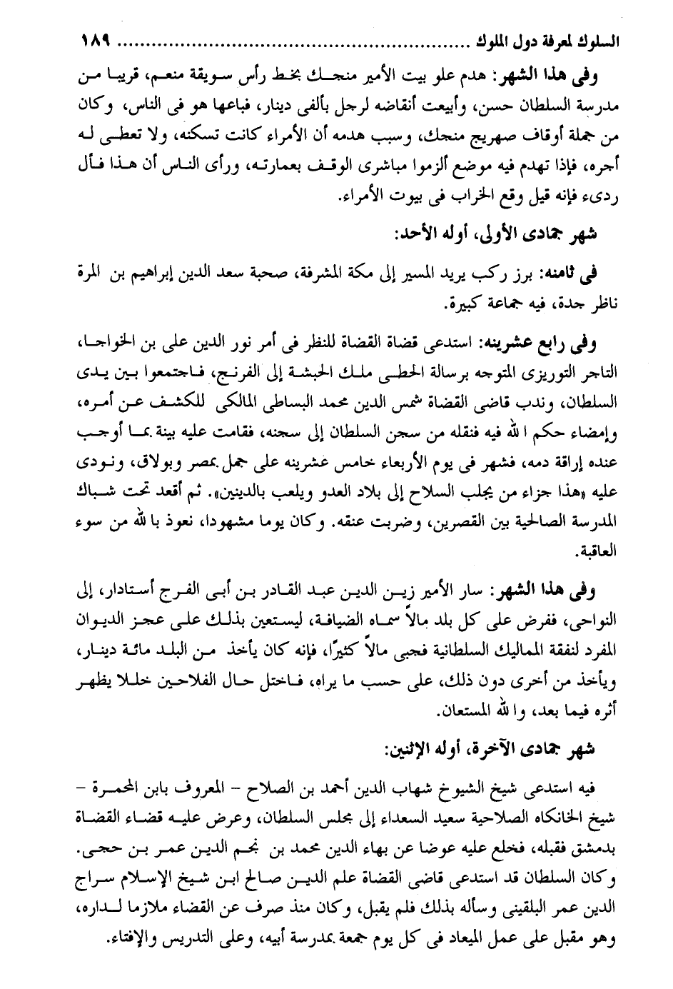 وَفِي هَذَا الشَّهْر: هدم علو بَيت الْأَمِير منجك بِخَط رَأس سويقة منعم قَرِيبا من مدرسة السُّلْطَان حسن وأبيعت أنقاضه لرجل بألفي دِينَار فَبَاعَهَا هُوَ فِي النَّاس وَكَانَ من جملَة أوقاف صهريج منجك وَسبب هَدمه أَن الْأُمَرَاء كَانَت تسكنه وَلَا تُعْطِي لَهُ أجره فَإِذا تهدم فِيهِ مَوضِع ألزموا مباشري الْوَقْف بعمارته وَرَأى النَّاس أَن هَذَا فأل رَدِيء فَإِنَّهُ قيل وَقع الخراب فِي بيُوت الْأُمَرَاء. شهر جُمَادَى الأولى أَوله الْأَحَد: فِي ثامنه: برز ركب يُرِيد الْمسير إِلَى مَكَّة المشرفة صُحْبَة سعد الدّين إِبْرَاهِيم بن الْمرة نَاظر جدة فِيهِ جمَاعَة كَبِيرَة. وَفِي رَابِع عشرينه: استدعى قُضَاة الْقُضَاة للنَّظَر فِي أَمر نور الدّين عَليّ بن الخواجا التَّاجِر التوريزي المتوجه برسالة الحطي ملك الْحَبَشَة إِلَى الفرنج فَاجْتمعُوا بَين يَدي السُّلْطَان وَندب قَاضِي الْقُضَاة شمس الدّين مُحَمَّد الْبِسَاطِيّ الْمَالِكِي للكشف عَن أمره وإمضاء حكم الله فِيهِ فنقله من سجن السُّلْطَان إِلَى سجنه فَقَامَتْ عَلَيْهِ بَيِّنَة بِمَا أوجب عِنْده إِرَاقَة دَمه فشهر فِي يَوْم الْأَرْبَعَاء خَامِس عشرينه على جمل بِمصْر وبولاق وَنُودِيَ عَلَيْهِ هَذَا جَزَاء من يجلب السِّلَاح إِلَى بِلَاد الْعَدو ويلعب بالدينين. ثمَّ أقعد تَحت شباك الْمدرسَة الصالحية بَين القصرين وَضربت عُنُقه. وَكَانَ يَوْمًا مشهوداً نَعُوذ بِاللَّه من سوء الْعَاقِبَة. وَفِي هَذَا الشَّهْر: سَار الْأَمِير زين الدّين عبد الْقَادِر بن أبي الْفرج أستادار إِلَى النواحي فَفرض على كل بلد مَالا سَمَّاهُ الضِّيَافَة ليستعين بذلك على عجز الدِّيوَان الْمُفْرد لنفقة المماليك السُّلْطَانِيَّة فجبي مَالا كثيرا فَإِنَّهُ كَانَ يَأْخُذ من الْبَلَد مائَة دِينَار وَيَأْخُذ من أُخْرَى دون ذَلِك على حسب مَا يرَاهُ فاختل حَال الفلاحين خللاً يظْهر أَثَره فِيمَا بعد وَالله الْمُسْتَعَان. شهر جُمَادَى الْآخِرَة أَوله الِاثْنَيْنِ: فِيهِ استدعى شيخ الشُّيُوخ شهَاب الدّين أَحْمد بن الصّلاح - الْمَعْرُوف بِابْن المحمرة - شيخ الخانكاه الصلاحية سعيد السُّعَدَاء إِلَى مجْلِس السُّلْطَان وَعرض عَلَيْهِ قَضَاء الْقُضَاة بِدِمَشْق فَقبله فَخلع عَلَيْهِ عوضا عَن بهاء الدّين مُحَمَّد بن نجم الدّين عمر بن حجي. وَكَانَ السُّلْطَان قد استدعى قَاضِي الْقُضَاة علم الدّين صَالح ابْن شيخ الْإِسْلَام سراج الدّين عمر البُلْقِينِيّ وَسَأَلَهُ بذلك فَلم يقبل وَكَانَ مُنْذُ صرف عَن الْقَضَاء ملازماً لداره وَهُوَ مقبل على الميعاد فِي كل يَوْم جُمُعَة بمدرسة أَبِيه وعَلى التدريس والإفتاء.