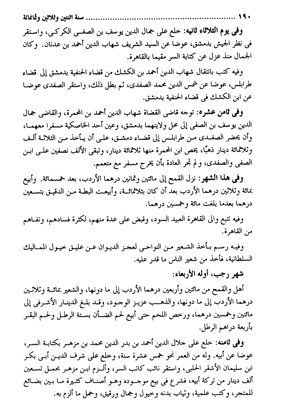 وَفِي يَوْم الثُّلَاثَاء ثَانِيه: خلع على جمال الدّين يُوسُف بن الصفي الكركي وَاسْتقر فِي نظر الْجَيْش بِدِمَشْق عوضا عَن السَّيِّد الشريف شهَاب الدّين أَحْمد بن عدنان. وَكَانَ الْجمال مُنْذُ عزل عَن كِتَابَة السِّرّ مُقيما بِالْقَاهِرَةِ. وَفِيه كتب بانتقال شهَاب الدّين أَحْمد بن الكشك من قَضَاء الْحَنَفِيَّة بِدِمَشْق إِلَى قَضَاء طرابلس عوضا عَن شمس الدّين مُحَمَّد الصَّفَدِي ثمَّ بَطل ذَلِك وَاسْتقر الصَّفَدِي عوضا عَن ابْن الكشك فِي قَضَاء الْحَنَفِيَّة بِدِمَشْق. وَفِي ثامن عشره: توجه قَاضِي الْقُضَاة شهَاب الدّين أَحْمد بن المحمرة وَالْقَاضِي جمال الدّين يُوسُف بن الصفي إِلَى مَحل ولايتهما بِدِمَشْق وَعين أحد الخاصكية مُسْفِرًا مَعَهُمَا وَأَن يحضر الصَّفَدِي من طرابلس إِلَى قَضَاء دمشق على أَن يَأْخُذ من الثَّلَاثَة ألف وثلاثمائة دِينَار ذَهَبا يخص ابْن المحمرة مِنْهَا ثَلَاثمِائَة دِينَار وَتبقى الْألف نِصْفَيْنِ على ابْن الصفي والصفدي وَلم تجر الْعَادة بِأَن يخرج مُسْفِر مَعَ متعمم. وَفِي هَذَا الشَّهْر: نزل الْقَمْح إِلَى مِائَتَيْنِ وَثَمَانِينَ درهما الأردب بعد خَمْسمِائَة. وأبيع بِمِائَة وَثَلَاثِينَ درهما الأردب بعد أَن كَانَ بثلاثمائة وأبيعت البطة من الدَّقِيق بتسعين درهما بعد مَا بلغت مائَة وَخمسين درهما. وَفِيه تتبع وَالِي الْقَاهِرَة العبيد السود وَقبض على عدَّة مِنْهُم لِكَثْرَة فسادهم ونفاهم من الْقَاهِرَة وَفِيه رسم بِأخذ الشّعير من النواحي لعجز الدِّيوَان عَن عليق خُيُول المماليك السُّلْطَانِيَّة فَأخذ من شعير النَّاس مَا قدر عَلَيْهِ. شهر رَجَب أَوله الْأَرْبَعَاء: أهل والقمح من مِائَتَيْنِ وَأَرْبَعين درهما الأردب إِلَى مَا دونهَا وَالشَّجر بِمِائَة وَثَلَاثِينَ درهما الأردب إِلَى مَا دونهَا وَالذَّهَب عَزِيز الْوُجُود وَقد بلع الدِّينَار الأشرفي إِلَى مِائَتَيْنِ وَخمسين درهما وَرخّص اللَّحْم حَتَّى أبيع لحم الضَّأْن بِسِتَّة الرطل وَلحم الْبَقر بأَرْبعَة دَرَاهِم الرطل. وَفِي ثامنه: خلع على جلال الدّين أَحْمد بن بدر الدّين مُحَمَّد بن مزهر بِكِتَابَة السِّرّ عوضا عَن أَبِيه. وَله من الْعُمر نَحْو خمس عشرَة سنة وخلع على شرف الدّين أبي بكر ابْن سُلَيْمَان الْأَشْقَر الْحلَبِي وَاسْتقر نَائِب كَاتب السِّرّ وألزم ابْن مزهر بِحمْل تسعين ألف دِينَار من تَرِكَة أَبِيه فشرع فِي بيع موجوده وَهُوَ أَصْنَاف كَثِيرَة مَا بَين بضائع للمتجر وَكتب علمية وَثيَاب بدنه وخيول وجمال ورقيق وَحمل مَا ألزم بِهِ.