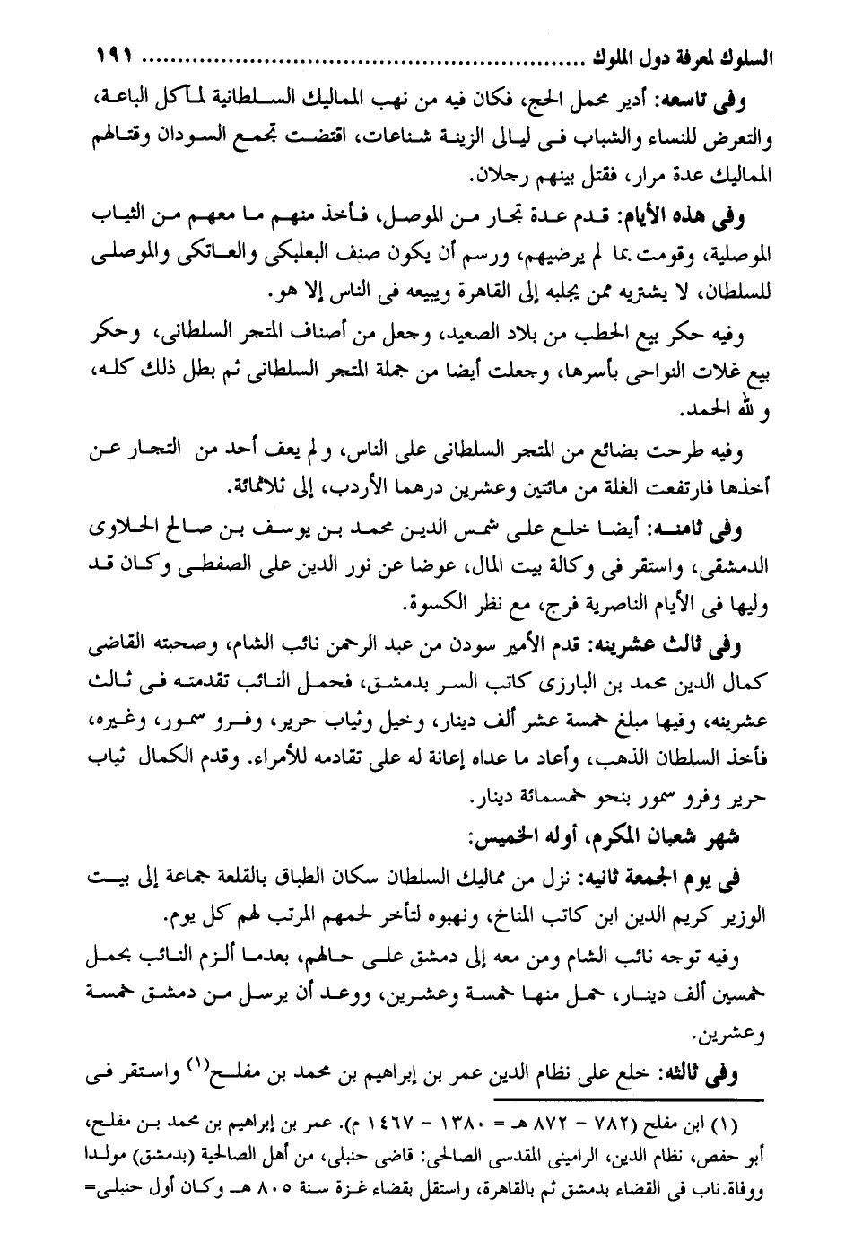 وَفِي تاسعه: أدير محمل الْحَج فَكَانَ فِيهِ من نهب المماليك السُّلْطَانِيَّة لمآكل الباعة والتعرض للنِّسَاء والشباب فِي ليَالِي الزِّينَة شناعات اقْتَضَت تجمع السودَان وقتالهم المماليك عدَّة مرار فَقتل بَينهم رجلَانِ. وَفِي هَذِه الْأَيَّام: قدم عدَّة تجار من الْموصل فَأخذ مِنْهُم مَا مَعَهم من الثِّيَاب الموصلية وقومت بِمَا لم يرضيهم ورسم أَن يكون صنف البعلبكي والعاتكي والموصلي للسُّلْطَان لَا يَشْتَرِيهِ مِمَّن يجلبه إِلَى الْقَاهِرَة ويبيعه فِي النَّاس إِلَّا هُوَ. وَفِيه حكر بيع الْحَطب من بِلَاد الصَّعِيد وَجعل من أَصْنَاف المتجر السلطاني وحكر بيع غلات النواحي بأسرها وَجعلت أَيْضا من جملَة المتجر السلطاني ثمَّ بَطل ذَلِك كُله وَللَّه الْحَمد. وَفِيه طرحت بضائع من المتجر السلطاني على النَّاس وَلم يعف أحد من التُّجَّار عَن أَخذهَا فارتفعت الْغلَّة من مِائَتَيْنِ وَعشْرين درهما الأردب إِلَى ثَلَاثمِائَة. وَفِي ثامنه: أَيْضا خلع على شمس الدّين مُحَمَّد بن يُوسُف بن صَالح الحلاوي الدِّمَشْقِي وَاسْتقر فِي وكَالَة بَيت المَال عوضا عَن نور الدّين عَليّ الصَّفَدِي وَكَانَ قد وَليهَا فِي الْأَيَّام الناصريه فرج مَعَ نظر الْكسْوَة. وَفِي ثَالِث عشرينه: قدم الْأَمِير سودن من عبد الرَّحْمَن نَائِب الشَّام وصحبته القَاضِي كَمَال الدّين مُحَمَّد بن الْبَارِزِيّ كَاتب السِّرّ بِدِمَشْق فَحمل النَّائِب تقدمته فِي ثَالِث عشرينه وفيهَا مبلغ خَمْسَة عشر ألف دِينَار وخيل وَثيَاب حَرِير وفرو سمور وَغَيره فَأخذ السُّلْطَان الذَّهَب وَأعَاد مَا عداهُ إِعَانَة لَهُ على تقادمه لِلْأُمَرَاءِ. وَقدم الْكَمَال ثِيَاب حَرِير وفرو سمور بِنَحْوِ خَمْسمِائَة دِينَار. شهر شعْبَان المكرم أَوله الْخَمِيس: فِي يَوْم الْجُمُعَة ثَانِيه: نزل من مماليك السُّلْطَان سكان الطباق بالقلعة جمَاعَة إِلَى بَيت الْوَزير كريم الدّين ابْن كَاتب المناخ ونهبوه لتأخر لحمهم الْمُرَتّب لَهُم كل يَوْم. وَفِيه توجه نَائِب الشَّام وَمن مَعَه إِلَى دمشق على حَالهم بعد مَا ألزم النَّائِب بِحمْل خمسين ألف دِينَار حمل مِنْهَا خَمْسَة وَعشْرين ووعد أَن يُرْسل من دمشق خَمْسَة وَعشْرين. وَفِي ثالثه: خلع على نظام الدّين عمر بن إِبْرَاهِيم بن مُحَمَّد بن مُفْلِح وَاسْتقر فِي